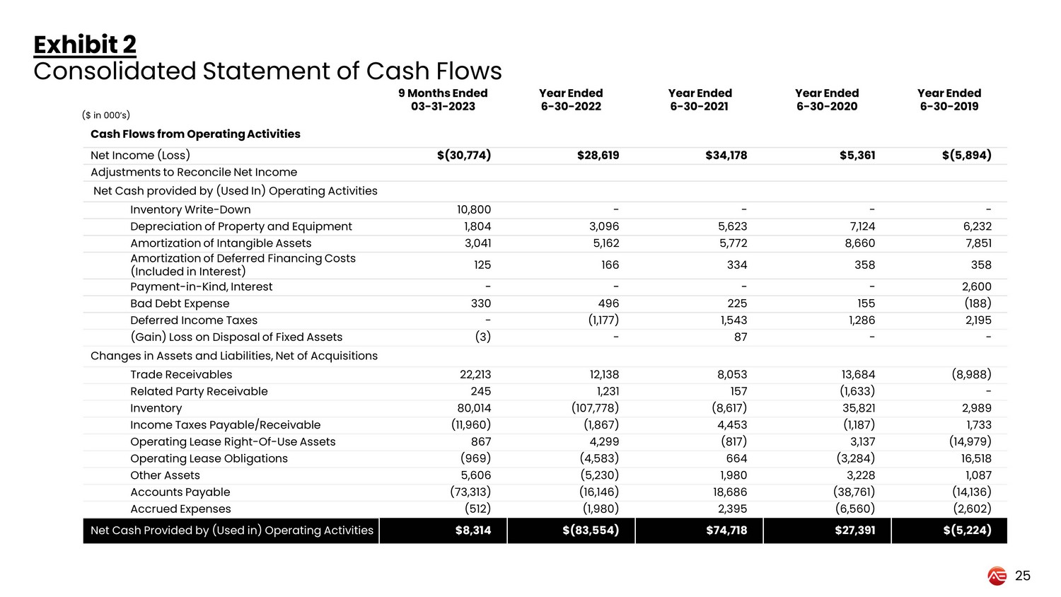 9 Months Ended 03 - 31 - 2023 Year Ended 6 - 30 - 2022 Year Ended 6 - 30 - 2021 Year Ended 6 - 30 - 2020 Year Ended 6 - 30 - 2019 Cash Flows from Operating Activities Net Income (Loss) $(30,774) $28,619 $34,178 $5,361 $(5,894) Adjustments to Reconcile Net Income Net Cash provided by (Used In) Operating Activities Inventory Write - Down 10,800 - - - - Depreciation of Property and Equipment 1,804 3,096 5,623 7,124 6,232 Amortization of Intangible Assets 3,041 5,162 5,772 8,660 7,851 Amortization of Deferred Financing Costs (Included in Interest) 125 166 334 358 358 Payment - in - Kind, Interest - - - - 2,600 Bad Debt Expense 330 496 225 155 (188) Deferred Income Taxes - (1,177) 1,543 1,286 2,195 (Gain) Loss on Disposal of Fixed Assets (3) - 87 - - Changes in Assets and Liabilities, Net of Acquisitions Trade Receivables 22,213 12,138 8,053 13,684 (8,988) Related Party Receivable 245 1,231 157 (1,633) - Inventory 80,014 (107,778) (8,617) 35,821 2,989 Income Taxes Payable/Receivable (11,960) (1,867) 4,453 (1,187) 1,733 Operating Lease Right - Of - Use Assets 867 4,299 (817) 3,137 (14,979) Operating Lease Obligations (969) (4,583) 664 (3,284) 16,518 Other Assets 5,606 (5,230) 1,980 3,228 1,087 Accounts Payable (73,313) (16,146) 18,686 (38,761) (14,136) Accrued Expenses (512) (1,980) 2,395 (6,560) (2,602) Net Cash Provided by (Used in) Operating Activities $8,314 $(83,554) $74,718 $27,391 $(5,224) Exhibit 2 Consolidated Statement of Cash Flows ($ in 000’s ) 25