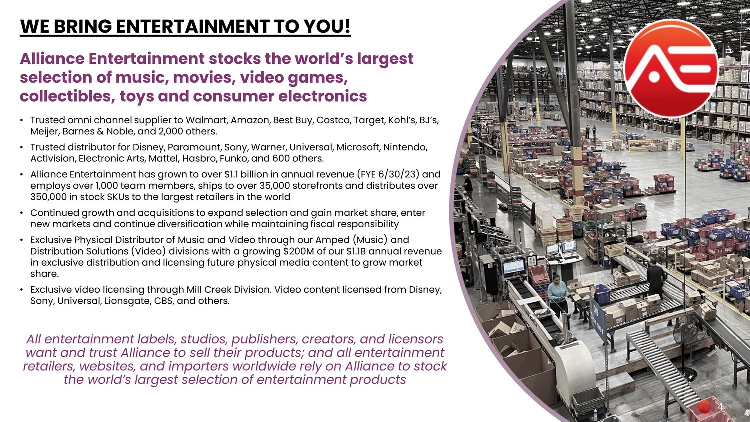 Legal Disclaimer 2 This presentation (together with oral statements made in connection herewith, this “Presentation”) is for informational purposes only . This Presentation shall not constitute an offer to sell, or the solicitation of an offer to buy, any securities, nor shall there be any sale of securities in any states or jurisdictions in which such offer, solicitation or sale would be unlawful . No representations or warranties, express or implied are given in, or in respect of, this Presentation . Although all information and opinions expressed in this Presentation, including industry and market data obtained from third - party industry publications and sources as well as from research reports prepared for other purposes, were obtained from sources believed to be reliable and are included in good faith, Alliance Entertainment Holding Corporation (“Alliance”) has not independently verified the information obtained from these sources and cannot assure you of the information’s accuracy or completeness . This information is subject to change . Some data are also based on the good faith estimates of Alliance, which are derived from their respective views of internal sources as well as the independent sources described above . Nothing herein should be construed as legal, financial, tax or other advice . You should consult your own advisers concerning any legal, financial, tax or other considerations concerning the opportunity described herein . The general explanations included in this Presentation cannot address, and are not intended to address, your specific investment objectives, financial situations or financial needs . Nothing contained herein shall be deemed a recommendation to any party to enter into any transaction or take any course of action . Forward Looking Statements Certain statements included in this Presentation that are not historical facts are forward - looking statements for purposes of the safe harbor provisions under the United States Private Securities Litigation Reform Act of 1995 . Forward - looking statements generally are accompanied by words such as “believe,” “may,” “will,” “estimate,” “continue,” “anticipate,” “intend,” “expect,” “should,” “would,” “plan,” “predict,” “potential,” “seem,” “seek,” “future,” “outlook,” and similar expressions that predict or indicate future events or trends or that are not statements of historical matters . These forward - looking statements include, but are not limited to, statements regarding estimates and forecasts of other financial and performance metrics and projections of market opportunity . These statements are based on various assumptions, whether identified in this Presentation, and on the current expectations of Alliance’s management and are not predictions of actual performance . These forward - looking statements are provided for illustrative purposes only and are not intended to serve as and must not be relied on by an investor as, a guarantee, an assurance, a prediction, or a definitive statement of fact or probability . Actual events and circumstances are difficult or impossible to predict and will differ from assumptions . Many actual events and circumstances are beyond the control of Alliance . These forward - looking statements are subject to a number of risks and uncertainties, including changes in domestic and foreign business, market, financial, political, and legal conditions ; failure to realize the anticipated benefits of the recently completed business combination ; risks related to the rollout of Alliance’s business and the timing of expected business milestones ; the effects of competition on Alliance’s future business ; risks and failure by Alliance to meet the covenant requirements of its revolving credit facility, our ability to issue equity or equity - linked securities or obtain debt financing in the future, and the potential negative effect on the price and liquidity of Alliance’s securities and those factors discussed in Alliance’s Annual Report on Form 10 - K for the fiscal year ended June 30 , 2023 under the heading “Risk Factors” . Additional risks related to Alliance’s business in particular include, but are not limited to competition, the ability of Alliance to grow and manage growth profitably, the ability of Alliance to maintain relationships with customers and suppliers and retain key employees ; changes in the applicable laws or regulations ; the possibility that Alliance may be adversely affected by other economic, business, material weaknesses in Alliance’s internal control over financial reporting, and/or competitive factors . There may be additional risks and uncertainties that Alliance does not presently know or currently believes are immaterial that could cause actual results to differ from those contained in the forward - looking statements . Such risk factors also include, among others, future growth expectations and acquisitions ; specific economic conditions in the United States ; changes in laws and regulations ; potential liability from future litigation ; the diversion of management time on acquisitions and integration related issues ; modifications or adjustments to Alliance’s financial statements as a result of applicable securities laws ; and general economic conditions . Most of these factors are outside Alliance’s control and are difficult to predict .