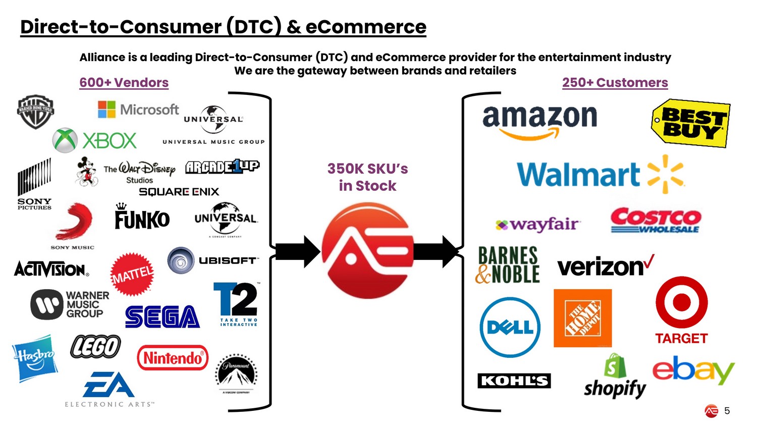 WE BRING ENTERTAINMENT TO YOU! Alliance Entertainment stocks the world’s largest selection of music, movies, video games, collectibles, toys and consumer electronics 4 • Trusted omni channel supplier to Walmart, Amazon, Best Buy, Costco, Target, Kohl’s, BJ’s, Meijer, Barnes & Noble, and 2,000 others. • Trusted distributor for Disney, Paramount, Sony, Warner, Universal, Microsoft, Nintendo, Activision, Electronic Arts, Mattel, Hasbro, Funko, and 600 others. • Alliance Entertainment has grown to over $1.1 billion in annual revenue (FYE 6/30/23) and employs over 1,000 team members, ships to over 35,000 storefronts and distributes over 350,000 in stock SKUs to the largest retailers in the world • Continued growth and acquisitions to expand selection and gain market share, enter new markets and continue diversification while maintaining fiscal responsibility • Exclusive Physical Distributor of Music and Video through our Amped (Music) and Distribution Solutions (Video) divisions with a growing $200M of our $1.1B annual revenue in exclusive distribution and licensing future physical media content to grow market share. • Exclusive video licensing through Mill Creek Division. Video content licensed from Disney, Sony, Universal, Lionsgate, CBS, and others. All entertainment labels, studios, publishers, creators, and licensors want and trust Alliance to sell their products; and all entertainment retailers, websites, and importers worldwide rely on Alliance to stock the world’s largest selection of entertainment products