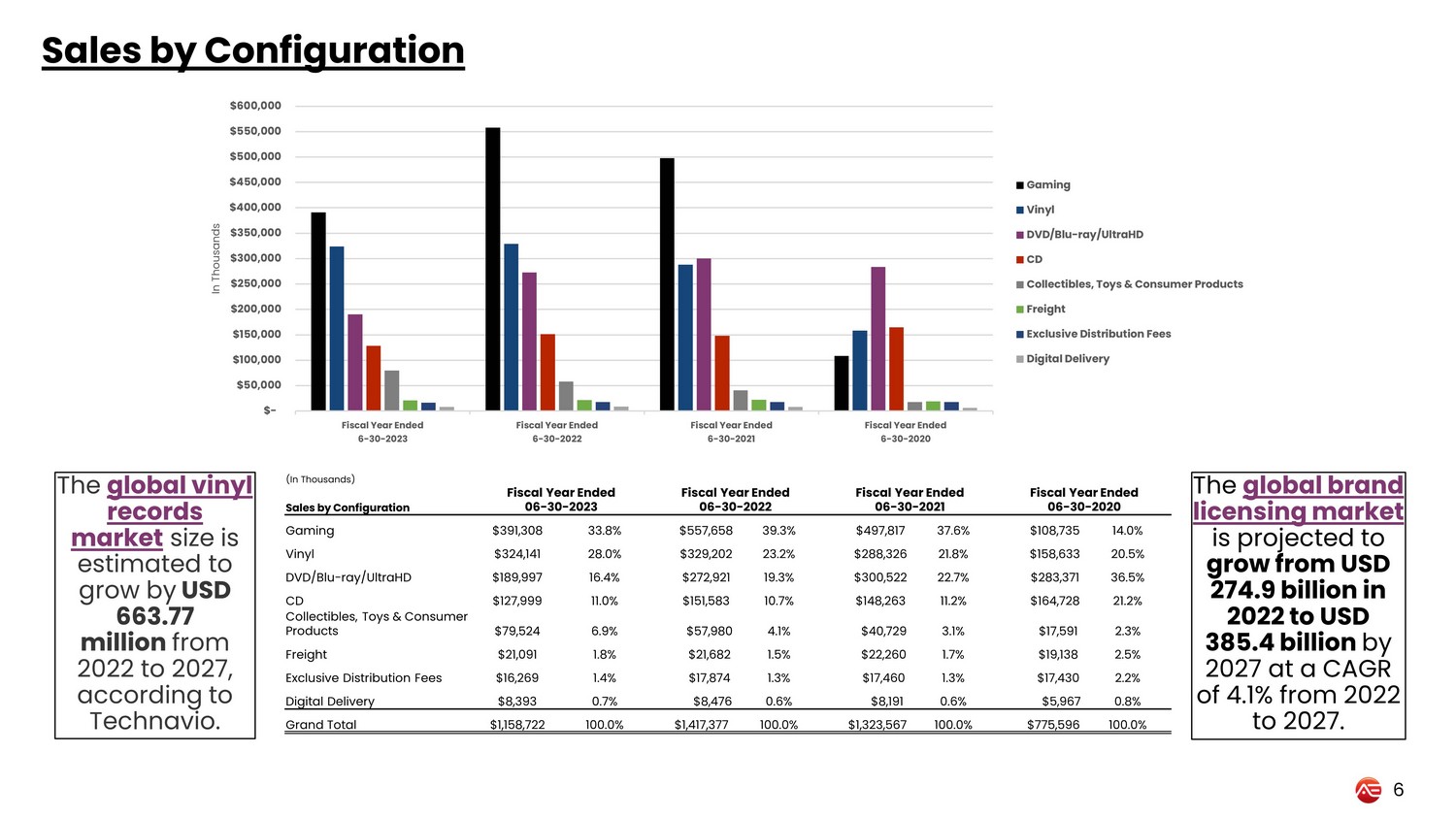 Sales by Configuration 6 (In Thousands) Sales by Configuration Fiscal Year Ended 06 - 30 - 2023 Fiscal Year Ended 06 - 30 - 2022 Fiscal Year Ended 06 - 30 - 2021 Fiscal Year Ended 06 - 30 - 2020 Gaming $391,308 33.8% $557,658 39.3% $497,817 37.6% $108,735 14.0% Vinyl $324,141 28.0% $329,202 23.2% $288,326 21.8% $158,633 20.5% DVD/Blu - ray/UltraHD $189,997 16.4% $272,921 19.3% $300,522 22.7% $283,371 36.5% CD $127,999 11.0% $151,583 10.7% $148,263 11.2% $164,728 21.2% Collectibles, Toys & Consumer Products $79,524 6.9% $57,980 4.1% $40,729 3.1% $17,591 2.3% Freight $21,091 1.8% $21,682 1.5% $22,260 1.7% $19,138 2.5% Exclusive Distribution Fees $16,269 1.4% $17,874 1.3% $17,460 1.3% $17,430 2.2% Digital Delivery $8,393 0.7% $8,476 0.6% $8,191 0.6% $5,967 0.8% Grand Total $1,158,722 100.0% $1,417,377 100.0% $1,323,567 100.0% $775,596 100.0% The global b rand l icensing m arket is projected to grow from USD 274.9 billion in 2022 to USD 385.4 billion by 2027 at a CAGR of 4.1% from 2022 to 2027. The global vinyl records market size is estimated to grow by USD 663.77 million from 2022 to 2027, according to Technavio. $- $50,000 $100,000 $150,000 $200,000 $250,000 $300,000 $350,000 $400,000 $450,000 $500,000 $550,000 $600,000 Fiscal Year Ended 6-30-2023 Fiscal Year Ended 6-30-2022 Fiscal Year Ended 6-30-2021 Fiscal Year Ended 6-30-2020 In Thousands Gaming Vinyl DVD/Blu-ray/UltraHD CD Collectibles, Toys & Consumer Products Freight Exclusive Distribution Fees Digital Delivery