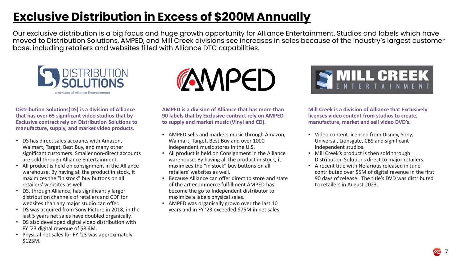 Distribution Solutions(DS) is a division of Alliance that has over 65 significant video studios that by Exclusive contract rely on Distribution Solutions to manufacture, supply, and market video products. • DS has direct sales accounts with Amazon, Walmart, Target, Best Buy, and many other significant customers. Smaller non - direct accounts are sold through Alliance Entertainment. • All product is held on consignment in the Alliance warehouse. By having all the product in stock, it maximizes the “in stock” buy buttons on all retailers' websites as well. • DS, through Alliance, has significantly larger distribution channels of retailers and CDF for websites than any major studio can offer. • DS was acquired from Sony Picture in 2018, in the last 5 years net sales have doubled organically. • DS also developed digital video distribution with FY ‘23 digital revenue of $8.4M. • Physical net sales for FY ‘23 was approximately $125M. Exclusive Distribution in Excess of $200M Annually Our exclusive distribution is a big focus and huge growth opportunity for Alliance Entertainment. Studios and labels which ha ve moved to Distribution Solutions, AMPED, and Mill Creek divisions see increases in sales because of the industry’s largest cus tom er base, including retailers and websites filled with Alliance DTC capabilities. AMPED is a division of Alliance that has more than 90 labels that by Exclusive contract rely on AMPED to supply and market music (Vinyl and CD). • AMPED sells and markets music through Amazon, Walmart, Target, Best Buy and over 1000 independent music stores in the U.S. • All product is held on Consignment in the Alliance warehouse. By having all the product in stock, it maximizes the “in stock” buy buttons on all retailers’ websites as well. • Because Alliance can offer direct to store and state of the art ecommerce fulfillment AMPED has become the go to Independent distributor to maximize a labels physical sales. • AMPED was organically grown over the last 10 years and in FY ‘23 exceeded $75M in net sales. Mill Creek is a division of Alliance that Exclusively licenses video content from studios to create, manufacture, market and sell video DVD’s. • Video content licensed from Disney, Sony, Universal, Lionsgate, CBS and significant independent studios. • Mill Creek’s product is then sold through Distribution Solutions direct to major retailers. • A recent title with Nefarious released in June contributed over $5M of digital revenue in the first 90 days of release. The title’s DVD was distributed to retailers in August 2023. 7