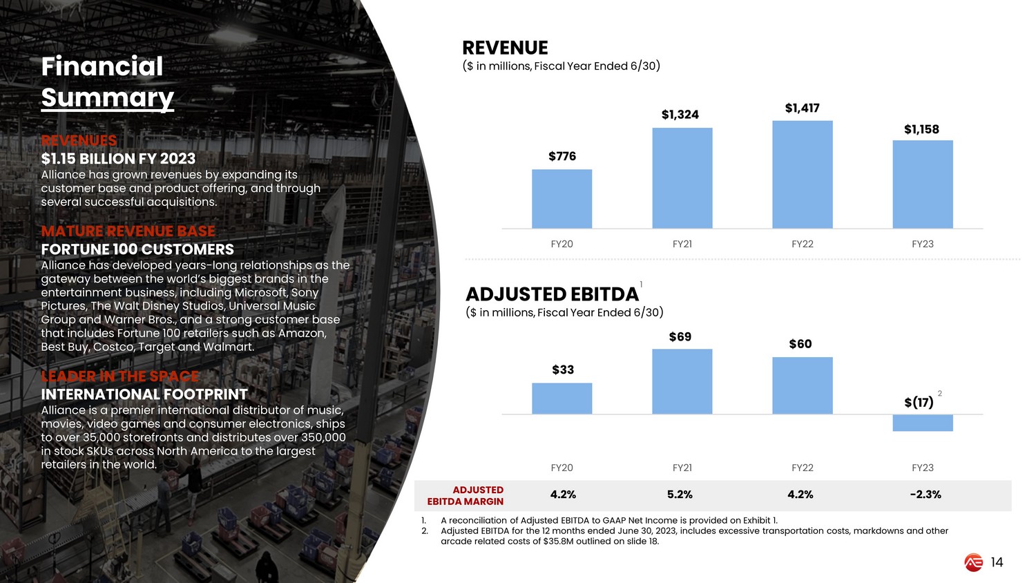 FY20 FY21 FY22 FY23 2 $(17) REVENUE ($ in millions, Fiscal Year Ended 6/30) ADJUSTED EBITDA ($ in millions, Fiscal Year Ended 6/30) $776 $1,324 $1,417 $33 $69 $60 ADJUSTED EBITDA MARGIN 4.2% 5.2% 4.2% Financial Summary REVENUES $1.15 BILLION FY 2023 Alliance has grown revenues by expanding its customer base and product offering, and through several successful acquisitions. MATURE REVENUE BASE FORTUNE 100 CUSTOMERS Alliance has developed years - long relationships as the gateway between the world’s biggest brands in the entertainment business, including Microsoft, Sony Pictures, The Walt Disney Studios, Universal Music Group and Warner Bros., and a strong customer base that includes Fortune 100 retailers such as Amazon, Best Buy, Costco, Target and Walmart. LEADER IN THE SPACE INTERNATIONAL FOOTPRINT Alliance is a premier international distributor of music, movies, video games and consumer electronics, ships to over 35,000 storefronts and distributes over 350,000 in stock SKUs across North America to the largest retailers in the world. 1. A reconciliation of Adjusted EBITDA to GAAP Net Income is provided on Exhibit 1. 2. Adjusted EBITDA for the 12 months ended June 30, 2023, includes excessive transportation costs, markdowns and other arcade related costs of $35.8M outlined on slide 18. 1 14 - 2.3% $1,158 FY20 FY21 FY22 FY23