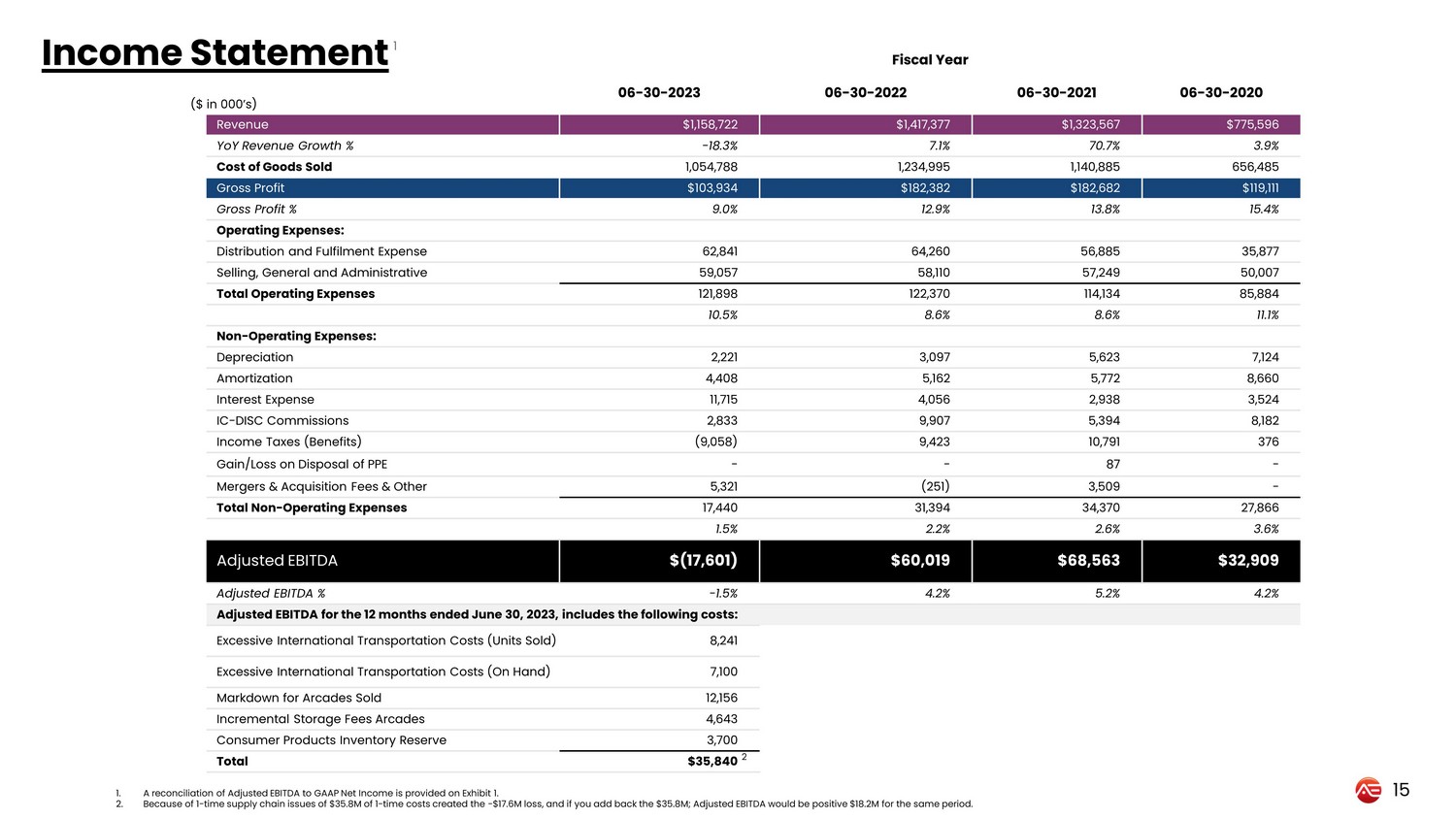 Fiscal Year 06 - 30 - 2023 06 - 30 - 2022 06 - 30 - 2021 06 - 30 - 2020 Revenue $1,158,722 $1,417,377 $1,323,567 $775,596 YoY Revenue Growth % - 18.3% 7.1% 70.7% 3.9% Cost of Goods Sold 1,054,788 1,234,995 1,140,885 656,485 Gross Profit $103,934 $182,382 $182,682 $119,111 Gross Profit % 9.0% 12.9% 13.8% 15.4% Operating Expenses: Distribution and Fulfilment Expense 62,841 64,260 56,885 35,877 Selling, General and Administrative 59,057 58,110 57,249 50,007 Total Operating Expenses 121,898 122,370 114,134 85,884 10.5% 8.6% 8.6% 11.1% Non - Operating Expenses: Depreciation 2,221 3,097 5,623 7,124 Amortization 4,408 5,162 5,772 8,660 Interest Expense 11,715 4,056 2,938 3,524 IC - DISC Commissions 2,833 9,907 5,394 8,182 Income Taxes (Benefits) (9,058) 9,423 10,791 376 Gain/Loss on Disposal of PPE - - 87 - Mergers & Acquisition Fees & Other 5,321 (251) 3,509 - Total Non - Operating Expenses 17,440 31,394 34,370 27,866 1.5% 2.2% 2.6% 3.6% Adjusted EBITDA $(17,601) $60,019 $68,563 $32,909 Adjusted EBITDA % - 1.5% 4.2% 5.2% 4.2% Adjusted EBITDA for the 12 months ended June 30, 2023, includes the following costs: Excessive International Transportation Costs (Units Sold) 8,241 Excessive International Transportation Costs (On Hand) 7,100 Markdown for Arcades Sold 12,156 Incremental Storage Fees Arcades 4,643 Consumer Products Inventory Reserve 3,700 Total $35,840 15 Income Statement ($ in 000’s) 1. A reconciliation of Adjusted EBITDA to GAAP Net Income is provided on Exhibit 1. 2. Because of 1 - time supply chain issues of $35.8M of 1 - time costs created the - $17.6M loss, and if you add back the $35.8M; Adjust ed EBITDA would be positive $18.2M for the same period. 1 2