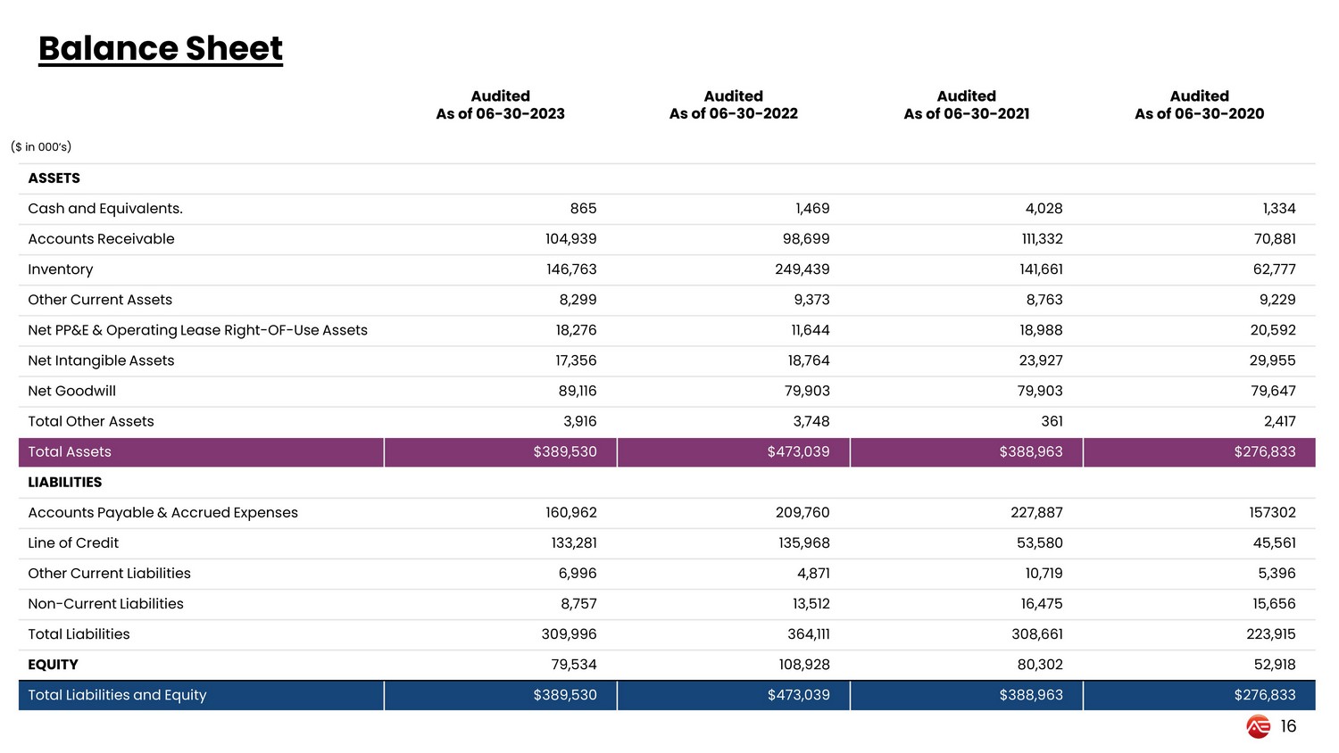 Audited As of 06 - 30 - 2023 Audited As of 06 - 30 - 2022 Audited As of 06 - 30 - 2021 Audited As of 06 - 30 - 2020 ASSETS Cash and Equivalents. 865 1,469 4,028 1,334 Accounts Receivable 104,939 98,699 111,332 70,881 Inventory 146,763 249,439 141,661 62,777 Other Current Assets 8,299 9,373 8,763 9,229 Net PP&E & Operating Lease Right - OF - Use Assets 18,276 11,644 18,988 20,592 Net Intangible Assets 17,356 18,764 23,927 29,955 Net Goodwill 89,116 79,903 79,903 79,647 Total Other Assets 3,916 3,748 361 2,417 Total Assets $389,530 $473,039 $388,963 $276,833 LIABILITIES Accounts Payable & Accrued Expenses 160,962 209,760 227,887 157302 Line of Credit 133,281 135,968 53,580 45,561 Other Current Liabilities 6,996 4,871 10,719 5,396 Non - Current Liabilities 8,757 13,512 16,475 15,656 Total Liabilities 309,996 364,111 308,661 223,915 EQUITY 79,534 108,928 80,302 52,918 Total Liabilities and Equity $389,530 $473,039 $388,963 $276,833 ($ in 000’s) Balance Sheet 16