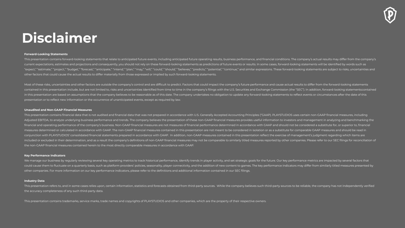 Disclaimer Forward-Looking Statements This presentation contains forward-looking statements that relate to anticipated future events, including anticipated future operating results, business performance, and financial conditions. The company’s actual results may differ from the company’s current expectations, estimates and projections and consequently, you should not rely on these forward-looking statements as predictions of future events or results. In some cases, forward-looking statements will be identified by words such as “expect,” “estimate,” “project,” “budget,” “forecast,” “anticipate,” “intend,” “plan,” “may,” “will,” “could,” “should,” “believes,” “predicts,” “potential,” “continue,” and similar expressions. These forward-looking statements are subject to risks, uncertainties and other factors that could cause the actual results to differ materially from those expressed or implied by such forward-looking statements. Most of these risks, uncertainties and other factors are outside the company’s control and are difficult to predict. Factors that could impact the company’s future performance and cause actual results to differ from the forward-looking statements contained in this presentation include, but are not limited to, risks and uncertainties identified from time to time in the company’s filings with the U.S. Securities and Exchange Commission (the “SEC”). In addition, forward-looking statements contained in this presentation are based on assumptions that the company believes to be reasonable as of this date. The company undertakes no obligation to update any forward-looking statements to reflect events or circumstances after the date of this presentation or to reflect new information or the occurrence of unanticipated events, except as required by law. Unaudited and Non-GAAP Financial Measures This presentation contains financial data that is not audited and financial data that was not prepared in accordance with U.S. Generally Accepted Accounting Principles (“GAAP). PLAYSTUDIOS uses certain non-GAAP financial measures, including Adjusted EBITDA, to analyze underlying business performance and trends. The company believes the presentation of these non-GAAP financial measures provides useful information to investors and management in analyzing and benchmarking the financial and operating performance of the company’s business. Non-GAAP financial measures are not measures of financial performance determined in accordance with GAAP and should not be considered a substitute for, or superior to, financial measures determined or calculated in accordance with GAAP. The non-GAAP financial measures contained in this presentation are not meant to be considered in isolation or as a substitute for comparable GAAP measures and should be read in conjunction with PLAYSTUDIOS’ consolidated financial statements prepared in accordance with GAAP. In addition, non-GAAP measures contained in this presentation reflect the exercise of management’s judgment regarding which items are included or excluded in their determination, and as a result the company’s definitions of non-GAAP financial measures may not be comparable to similarly titled measures reported by other companies. Please refer to our SEC filings for reconciliation of the non-GAAP financial measures contained herein to the most directly comparable measures in accordance with GAAP. Key Performance Indicators We manage our business by regularly reviewing several key operating metrics to track historical performance, identify trends in player activity, and set strategic goals for the future. Our key performance metrics are impacted by several factors that could cause them to fluctuate on a quarterly basis, such as platform providers’ policies, seasonality, player connectivity, and the addition of new content to games. The key performance indicators may differ from similarly titled measures presented by other companies. For more information on our key performance indicators, please refer to the definitions and additional information contained in our SEC filings. Industry Data This presentation refers to, and in some cases relies upon, certain information, statistics and forecasts obtained from third-party sources. While the company believes such third-party sources to be reliable, the company has not independently verified the accuracy completeness of any such third-party data. This presentation contains trademarks, service marks, trade names and copyrights of PLAYSTUDIOS and other companies, which are the property of their respective owners.
