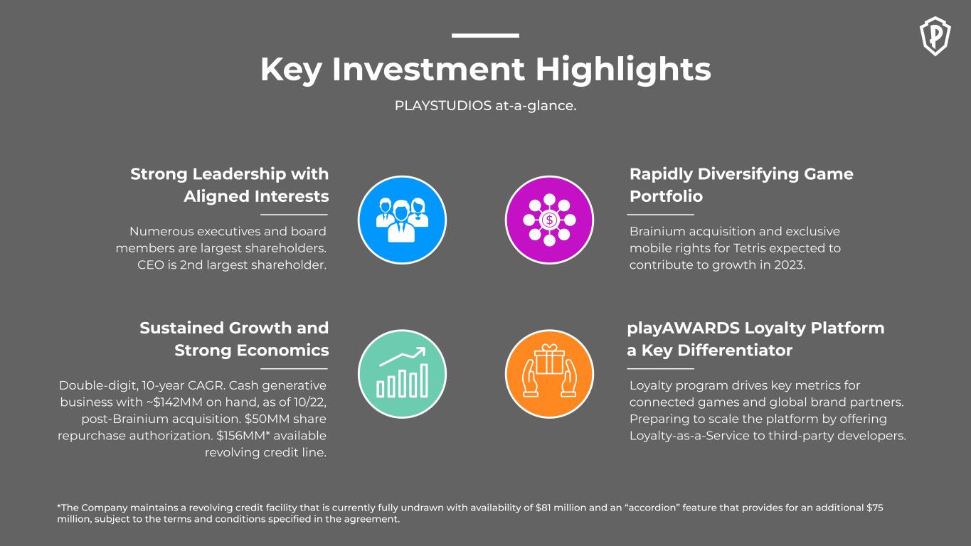 PLAYSTUDIOS at-a-glance. Key Investment Highlights Strong Leadership with Aligned Interests Numerous executives and board members are largest shareholders. CEO is 2nd largest shareholder. Rapidly Diversifying Game Portfolio Brainium acquisition and exclusive mobile rights for Tetris expected to contribute to growth in 2023. playAWARDS Loyalty Platform a Key Differentiator Loyalty program drives key metrics for connected games and global brand partners. Preparing to scale the platform by offering Loyalty-as-a-Service to third-party developers. *The Company maintains a revolving credit facility that is currently fully undrawn with availability of $81 million and an “accordion” feature that provides for an additional $75 million, subject to the terms and conditions specified in the agreement. Sustained Growth and Strong Economics Double-digit, 10-year CAGR. Cash generative business with ~$142MM on hand, as of 10/22, post-Brainium acquisition. $50MM share repurchase authorization. $156MM* available revolving credit line.