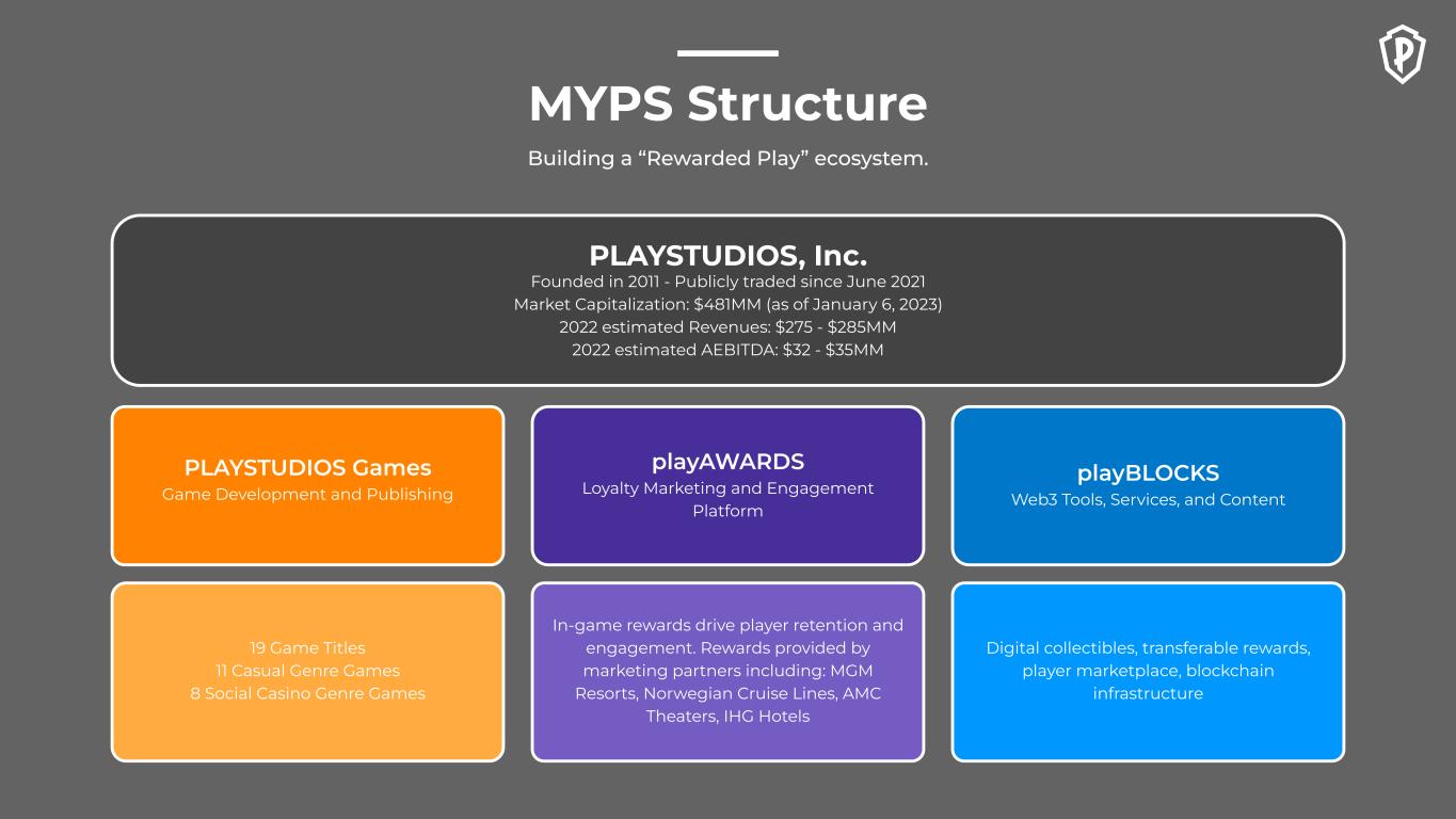 Building a “Rewarded Play” ecosystem. MYPS Structure playAWARDS Loyalty Marketing and Engagement Platform In-game rewards drive player retention and engagement. Rewards provided by marketing partners including: MGM Resorts, Norwegian Cruise Lines, AMC Theaters, IHG Hotels 19 Game Titles 11 Casual Genre Games 8 Social Casino Genre Games PLAYSTUDIOS Games Game Development and Publishing PLAYSTUDIOS, Inc. Founded in 2011 - Publicly traded since June 2021 Market Capitalization: $481MM (as of January 6, 2023) 2022 estimated Revenues: $275 - $285MM 2022 estimated AEBITDA: $32 - $35MM playBLOCKS Web3 Tools, Services, and Content Digital collectibles, transferable rewards, player marketplace, blockchain infrastructure
