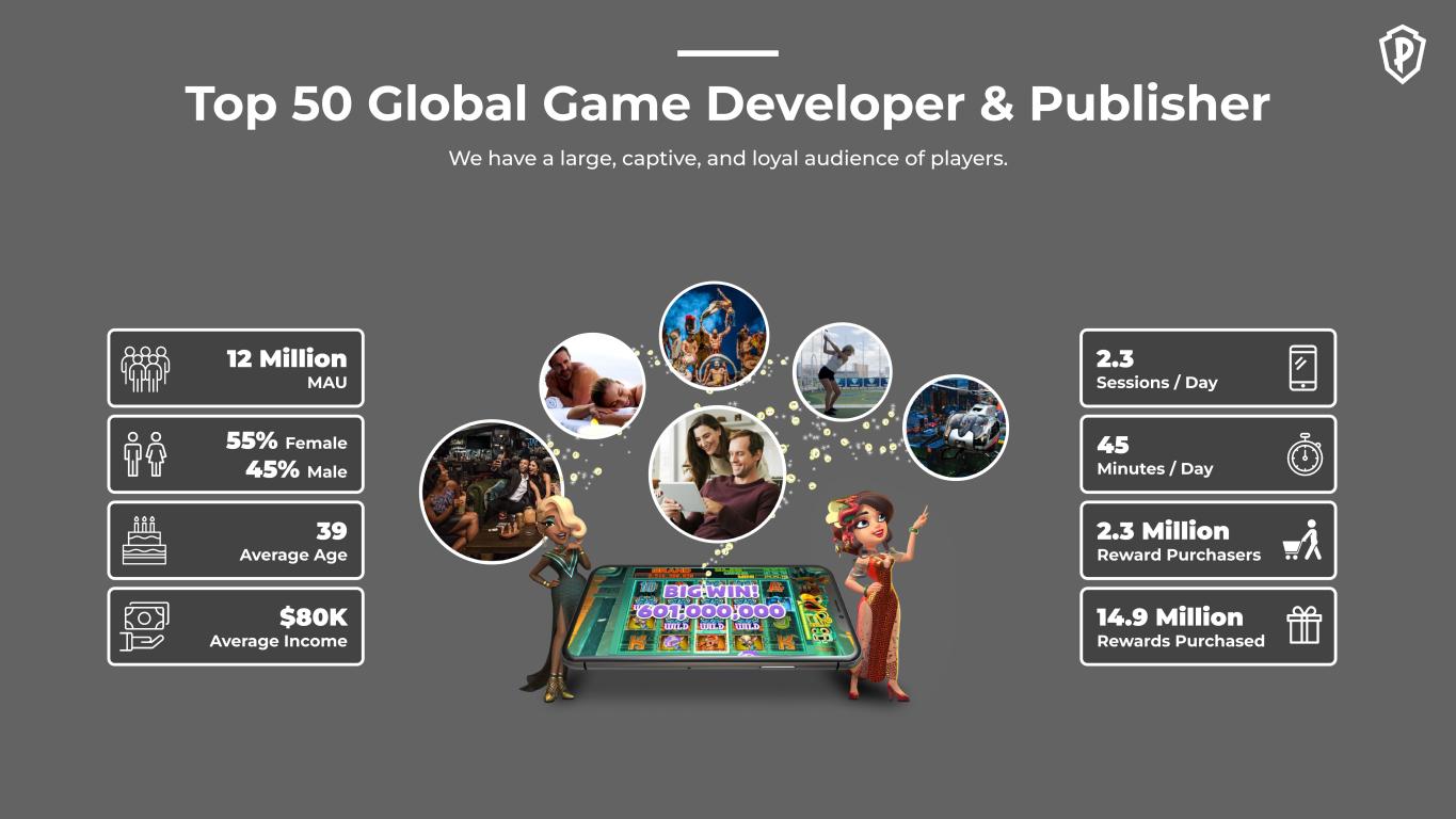 12 Million MAU 55% Female 45% Male 39 Average Age $80K Average Income 2.3 Sessions / Day 45 Minutes / Day 2.3 Million Reward Purchasers 14.9 Million Rewards Purchased We have a large, captive, and loyal audience of players. Top 50 Global Game Developer & Publisher