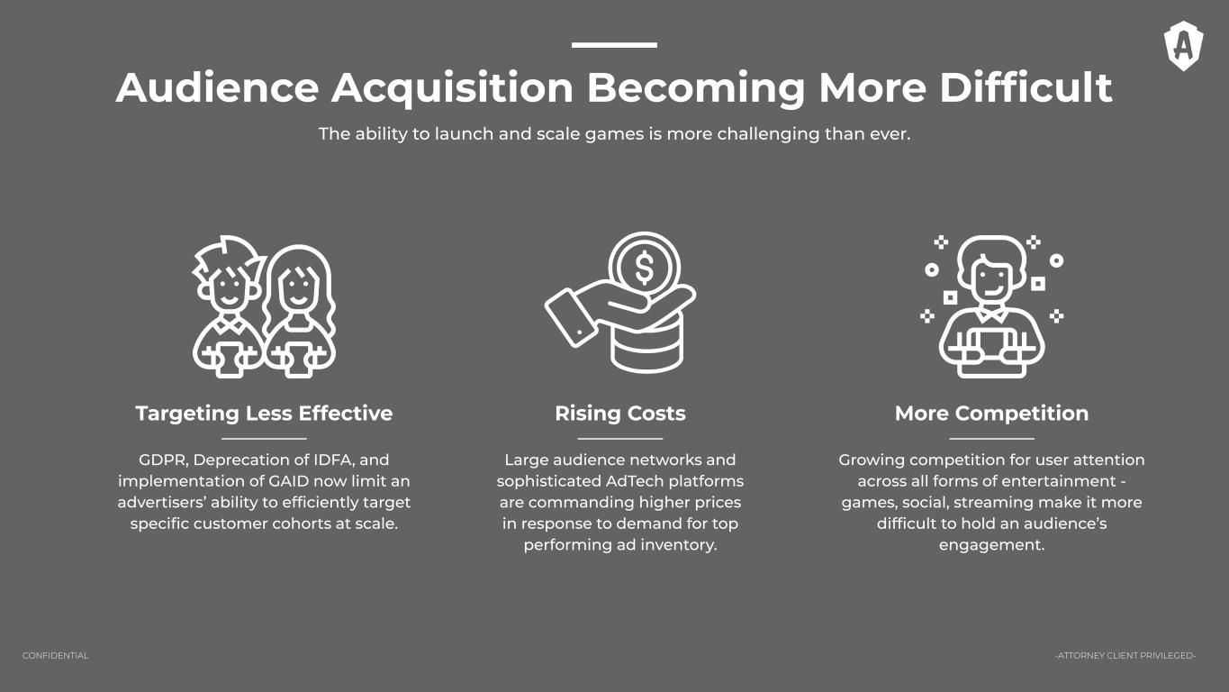 The ability to launch and scale games is more challenging than ever. -ATTORNEY CLIENT PRIVILEGED-CONFIDENTIAL More Competition Growing competition for user attention across all forms of entertainment - games, social, streaming make it more difficult to hold an audience’s engagement. Targeting Less Effective GDPR, Deprecation of IDFA, and implementation of GAID now limit an advertisers’ ability to efficiently target specific customer cohorts at scale. Rising Costs Large audience networks and sophisticated AdTech platforms are commanding higher prices in response to demand for top performing ad inventory. Audience Acquisition Becoming More Difficult