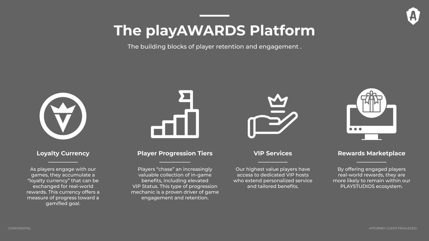 The playAWARDS Platform -ATTORNEY CLIENT PRIVILEGED-CONFIDENTIAL Player Progression Tiers Players “chase” an increasingly valuable collection of in-game benefits, including elevated VIP Status. This type of progression mechanic is a proven driver of game engagement and retention. Rewards Marketplace By offering engaged players real-world rewards, they are more likely to remain within our PLAYSTUDIOS ecosystem. Loyalty Currency As players engage with our games, they accumulate a “loyalty currency” that can be exchanged for real-world rewards. This currency offers a measure of progress toward a gamified goal. VIP Services Our highest value players have access to dedicated VIP hosts who extend personalized service and tailored benefits. The building blocks of player retention and engagement .