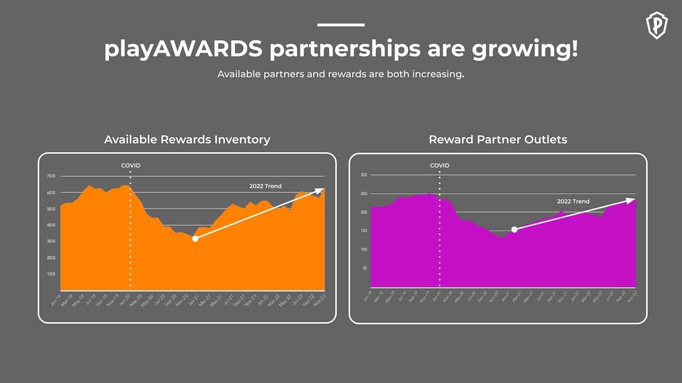 Available Rewards Inventory Reward Partner Outlets COVID COVID 2022 Trend 2022 Trend Available partners and rewards are both increasing. playAWARDS partnerships are growing!