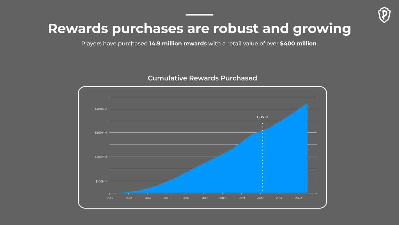 Cumulative Rewards Purchased COVID Players have purchased 14.9 million rewards with a retail value of over $400 million. Rewards purchases are robust and growing $400MM $300MM $200MM $100MM 2012 2013 2014 2015 2016 2017 2018 2019 2020 2021 2022