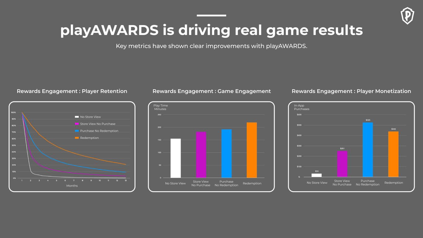 Rewards Engagement : Player Retention No Store View Store View No Purchase Purchase No Redemption Redemption Rewards Engagement : Game Engagement Play Time Minutes RedemptionNo Store View Store View No Purchase Purchase No Redemption Rewards Engagement : Player Monetization In-App Purchases Key metrics have shown clear improvements with playAWARDS. playAWARDS is driving real game results No Store View Store View No Purchase Purchase No Redemption Redemption Months