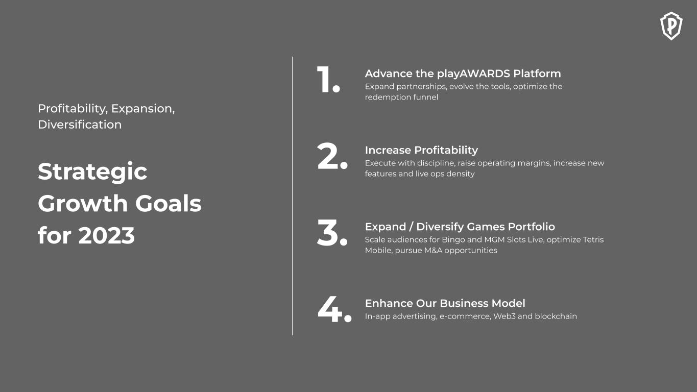1. 2. 3. Advance the playAWARDS Platform Expand partnerships, evolve the tools, optimize the redemption funnel Increase Profitability Execute with discipline, raise operating margins, increase new features and live ops density Expand / Diversify Games Portfolio Scale audiences for Bingo and MGM Slots Live, optimize Tetris Mobile, pursue M&A opportunities 4. Enhance Our Business Model In-app advertising, e-commerce, Web3 and blockchain Strategic Growth Goals for 2023 Profitability, Expansion, Diversification