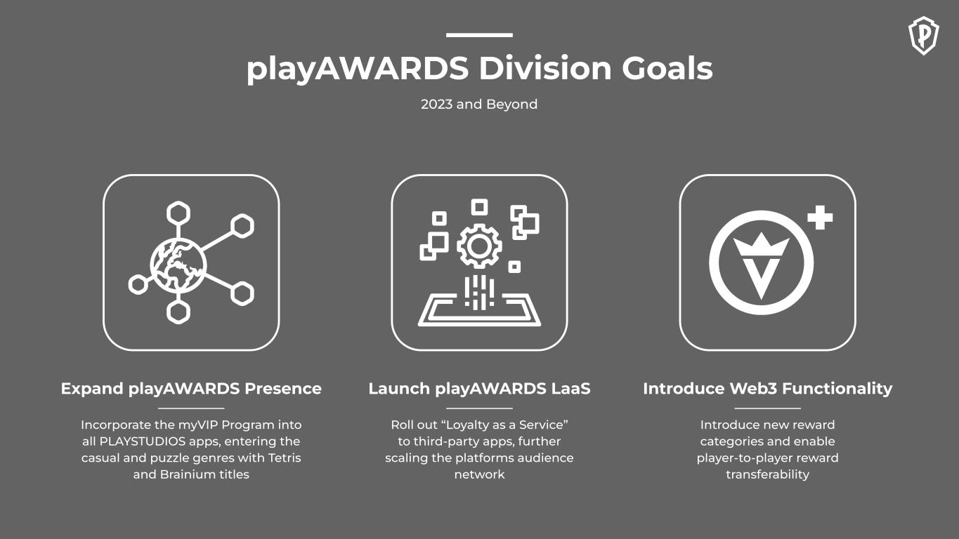 Expand playAWARDS Presence Incorporate the myVIP Program into all PLAYSTUDIOS apps, entering the casual and puzzle genres with Tetris and Brainium titles 2023 and Beyond playAWARDS Division Goals Launch playAWARDS LaaS Roll out “Loyalty as a Service” to third-party apps, further scaling the platforms audience network Introduce Web3 Functionality Introduce new reward categories and enable player-to-player reward transferability +