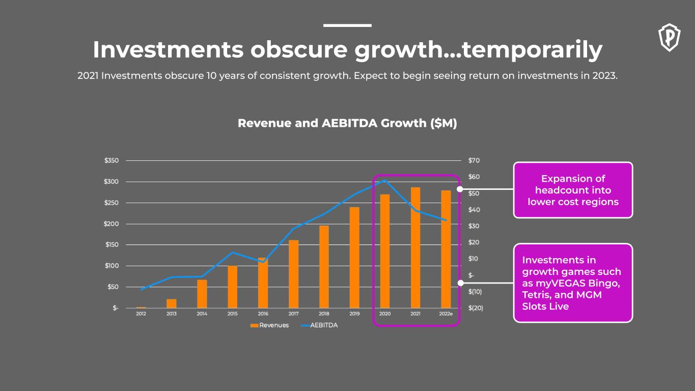 2021 Investments obscure 10 years of consistent growth. Expect to begin seeing return on investments in 2023. Investments obscure growth…temporarily Revenue and AEBITDA Growth ($M) Expansion of headcount into lower cost regions Investments in growth games such as myVEGAS Bingo, Tetris, and MGM Slots Live