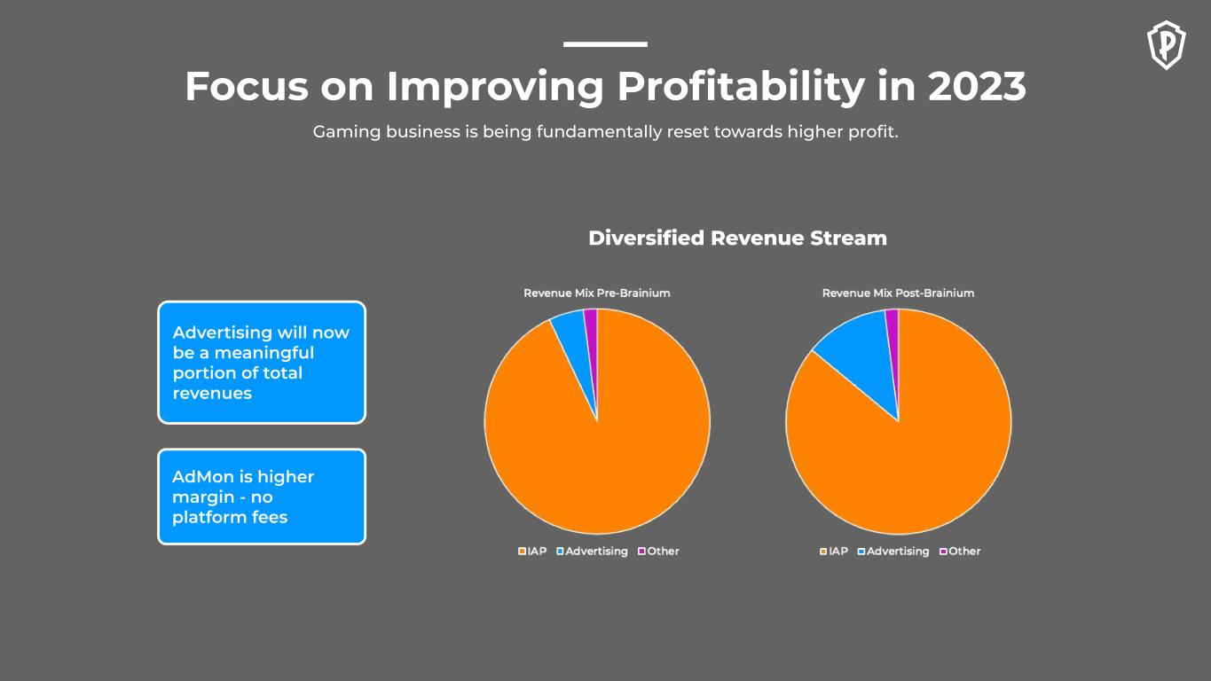 Gaming business is being fundamentally reset towards higher profit. Focus on Improving Profitability in 2023 Advertising will now be a meaningful portion of total revenues AdMon is higher margin - no platform fees Diversified Revenue Stream