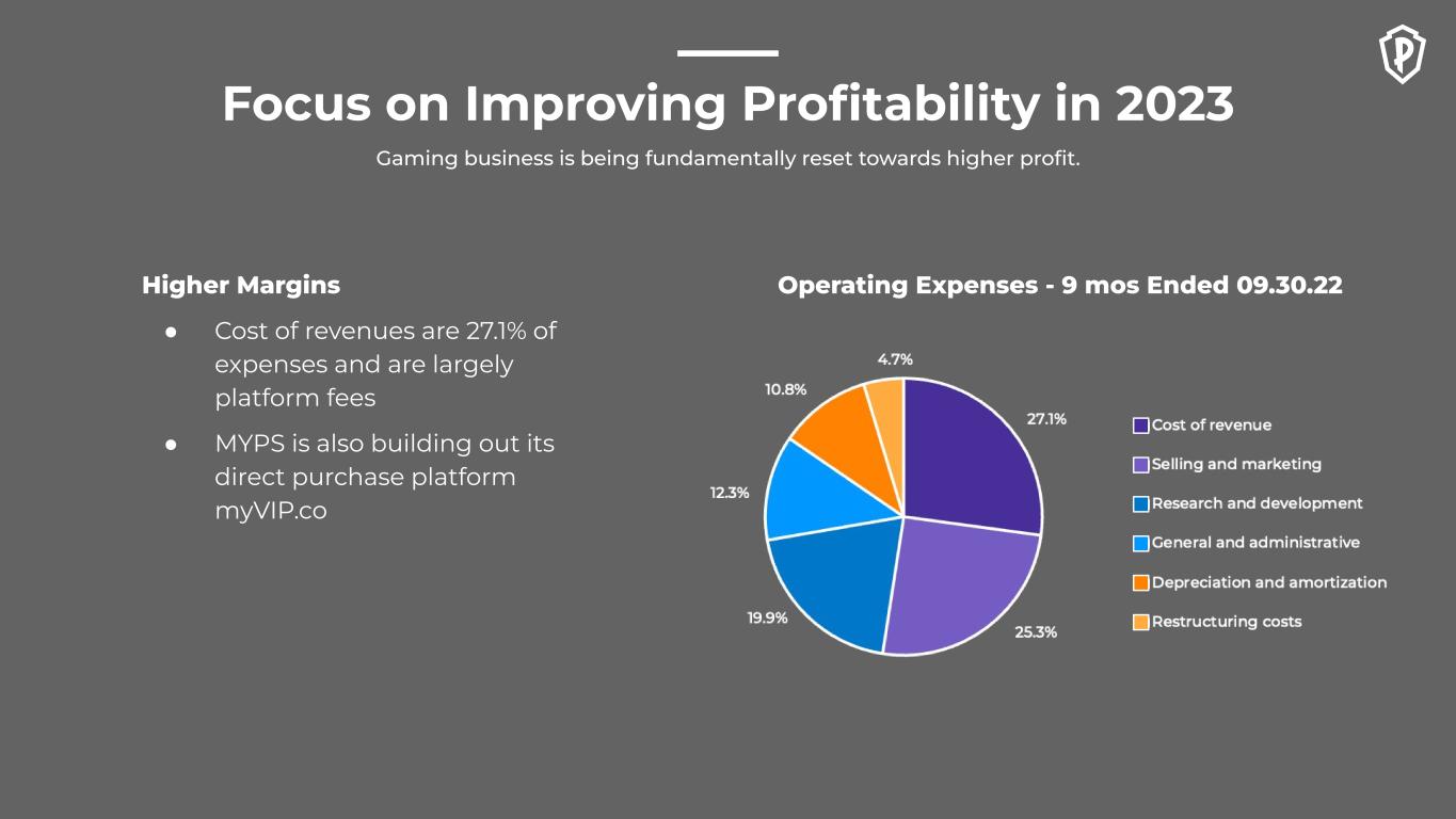 Gaming business is being fundamentally reset towards higher profit. Focus on Improving Profitability in 2023 Higher Margins ● Cost of revenues are 27.1% of expenses and are largely platform fees ● MYPS is also building out its direct purchase platform myVIP.co Operating Expenses - 9 mos Ended 09.30.22