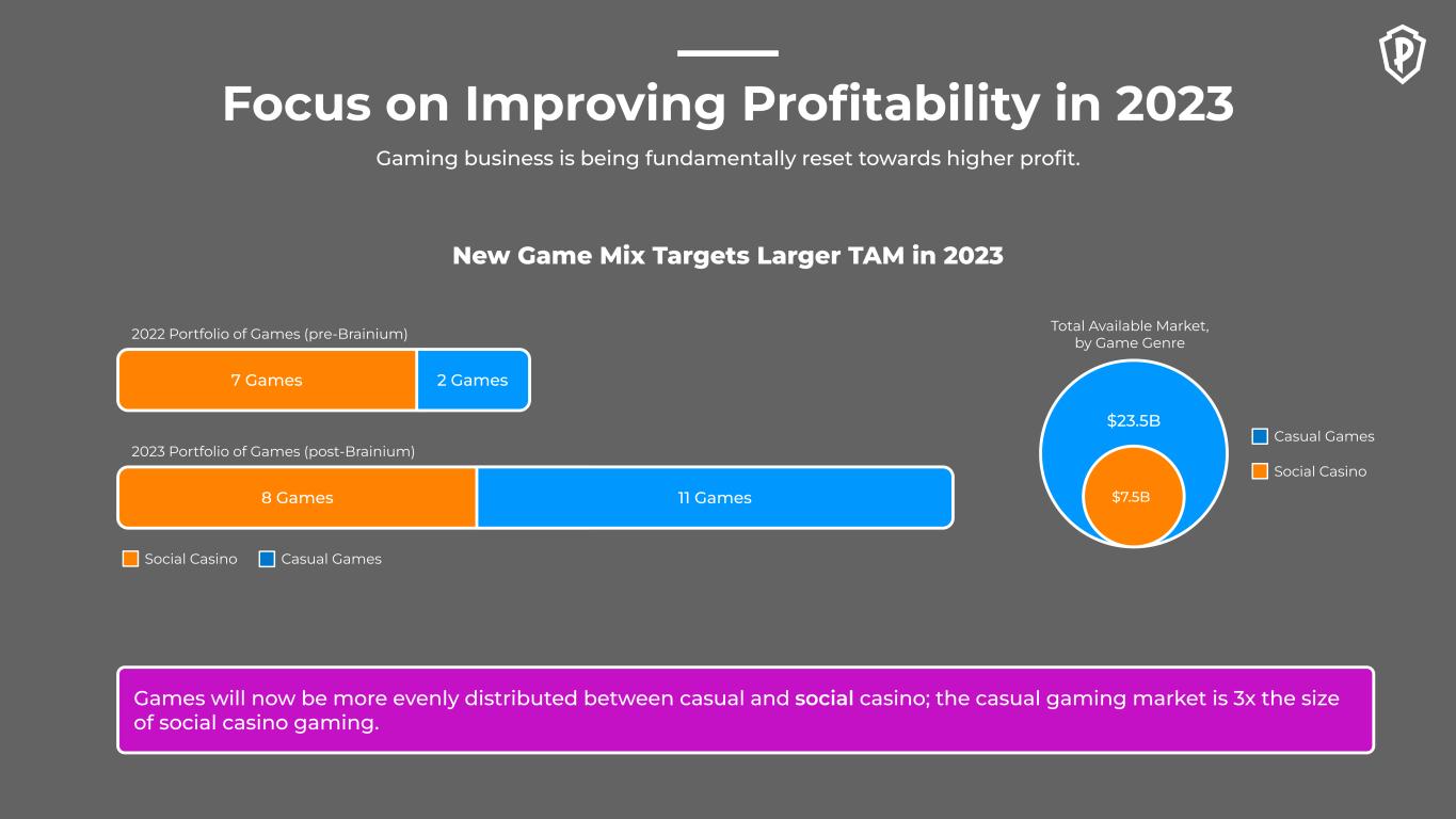 Gaming business is being fundamentally reset towards higher profit. Focus on Improving Profitability in 2023 Games will now be more evenly distributed between casual and social casino; the casual gaming market is 3x the size of social casino gaming. New Game Mix Targets Larger TAM in 2023 2023 Portfolio of Games (post-Brainium) 2022 Portfolio of Games (pre-Brainium) Social Casino Casual Games $7.5B Total Available Market, by Game Genre $23.5B 7 Games 2 Games 8 Games 11 Games Social Casino Casual Games