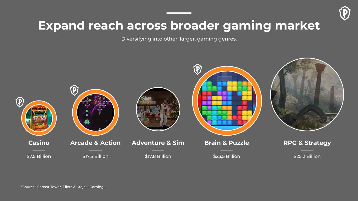 Casino $7.5 Billion Arcade & Action $17.5 Billion Adventure & Sim $17.8 Billion RPG & Strategy $25.2 Billion Brain & Puzzle $23.5 Billion Diversifying into other, larger, gaming genres. Expand reach across broader gaming market *Source: Sensor Tower, Eilers & Krejcik Gaming