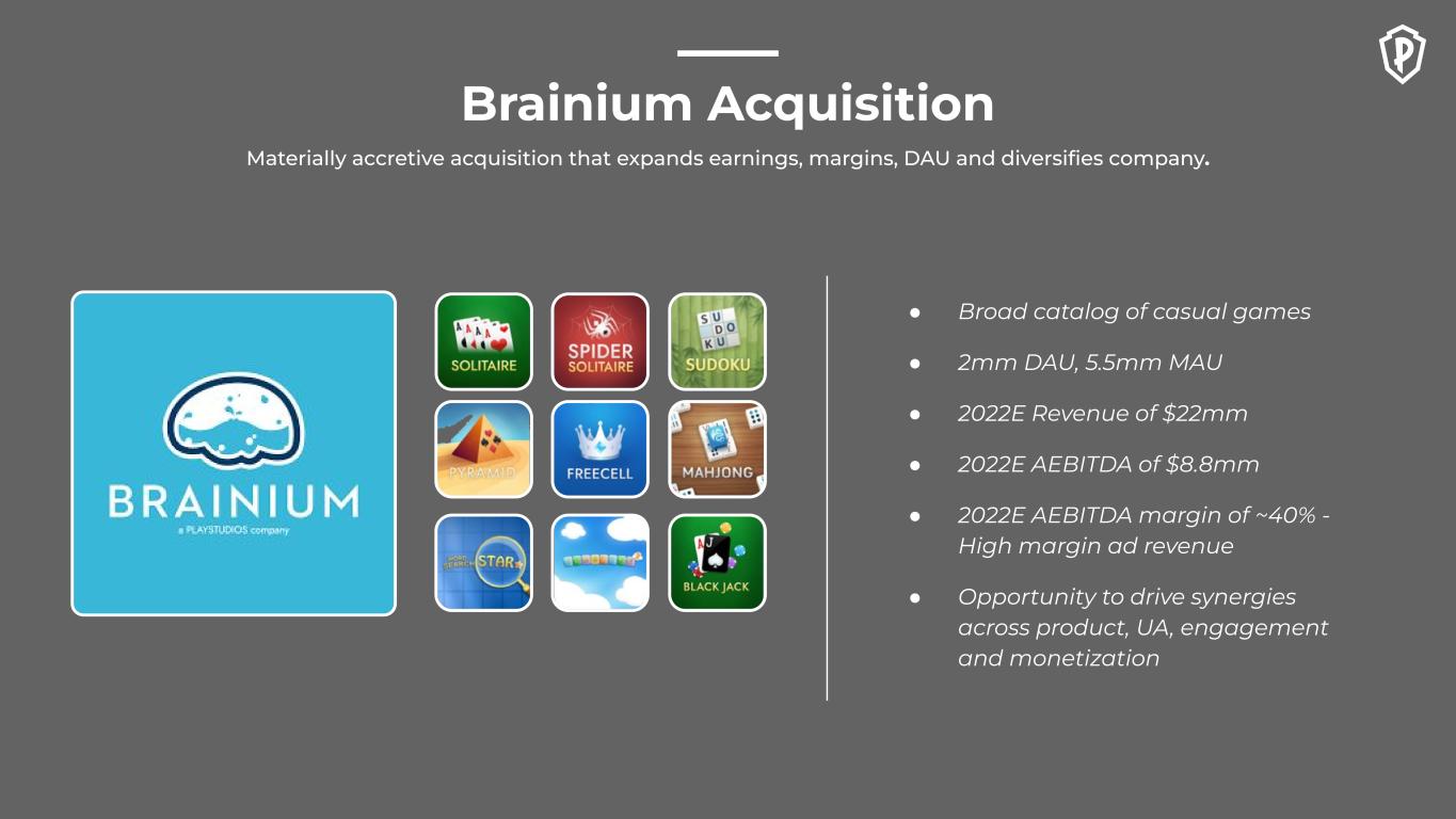 ● Broad catalog of casual games ● 2mm DAU, 5.5mm MAU ● 2022E Revenue of $22mm ● 2022E AEBITDA of $8.8mm ● 2022E AEBITDA margin of ~40% - High margin ad revenue ● Opportunity to drive synergies across product, UA, engagement and monetization Materially accretive acquisition that expands earnings, margins, DAU and diversifies company. Brainium Acquisition