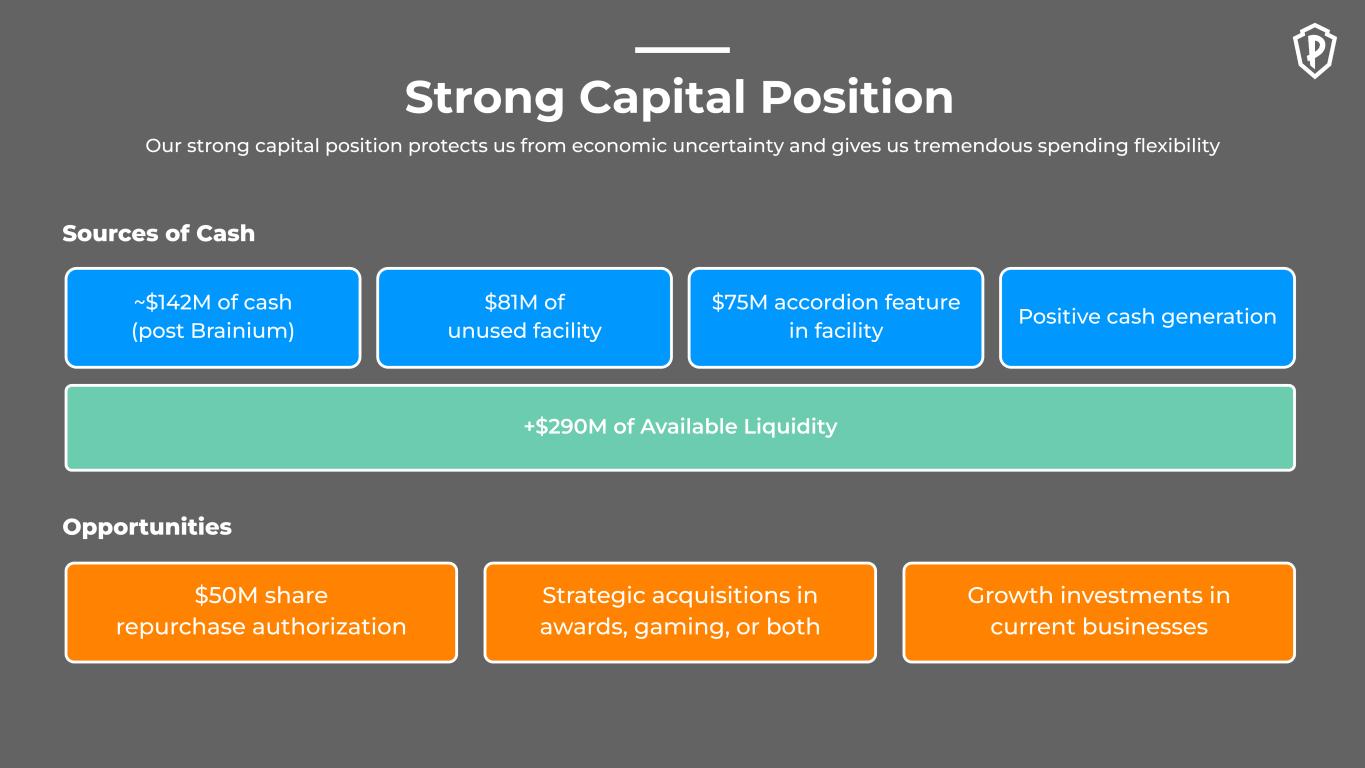 Our strong capital position protects us from economic uncertainty and gives us tremendous spending flexibility Strong Capital Position $50M share repurchase authorization ~$142M of cash (post Brainium) +$290M of Available Liquidity Sources of Cash Opportunities $81M of unused facility $75M accordion feature in facility Positive cash generation Strategic acquisitions in awards, gaming, or both Growth investments in current businesses