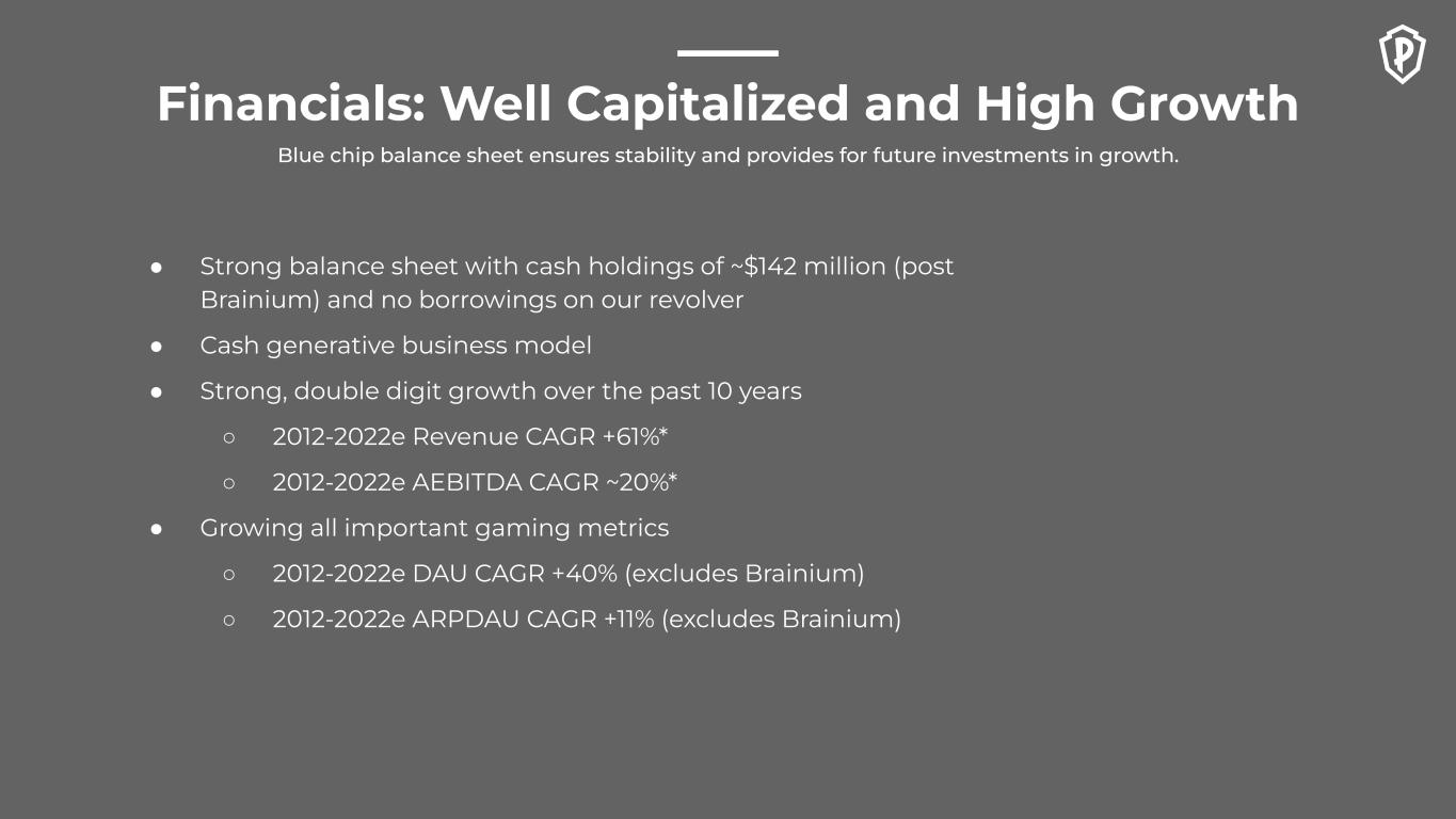 Blue chip balance sheet ensures stability and provides for future investments in growth. Financials: Well Capitalized and High Growth ● Strong balance sheet with cash holdings of ~$142 million (post Brainium) and no borrowings on our revolver ● Cash generative business model ● Strong, double digit growth over the past 10 years ○ 2012-2022e Revenue CAGR +61%* ○ 2012-2022e AEBITDA CAGR ~20%* ● Growing all important gaming metrics ○ 2012-2022e DAU CAGR +40% (excludes Brainium) ○ 2012-2022e ARPDAU CAGR +11% (excludes Brainium)