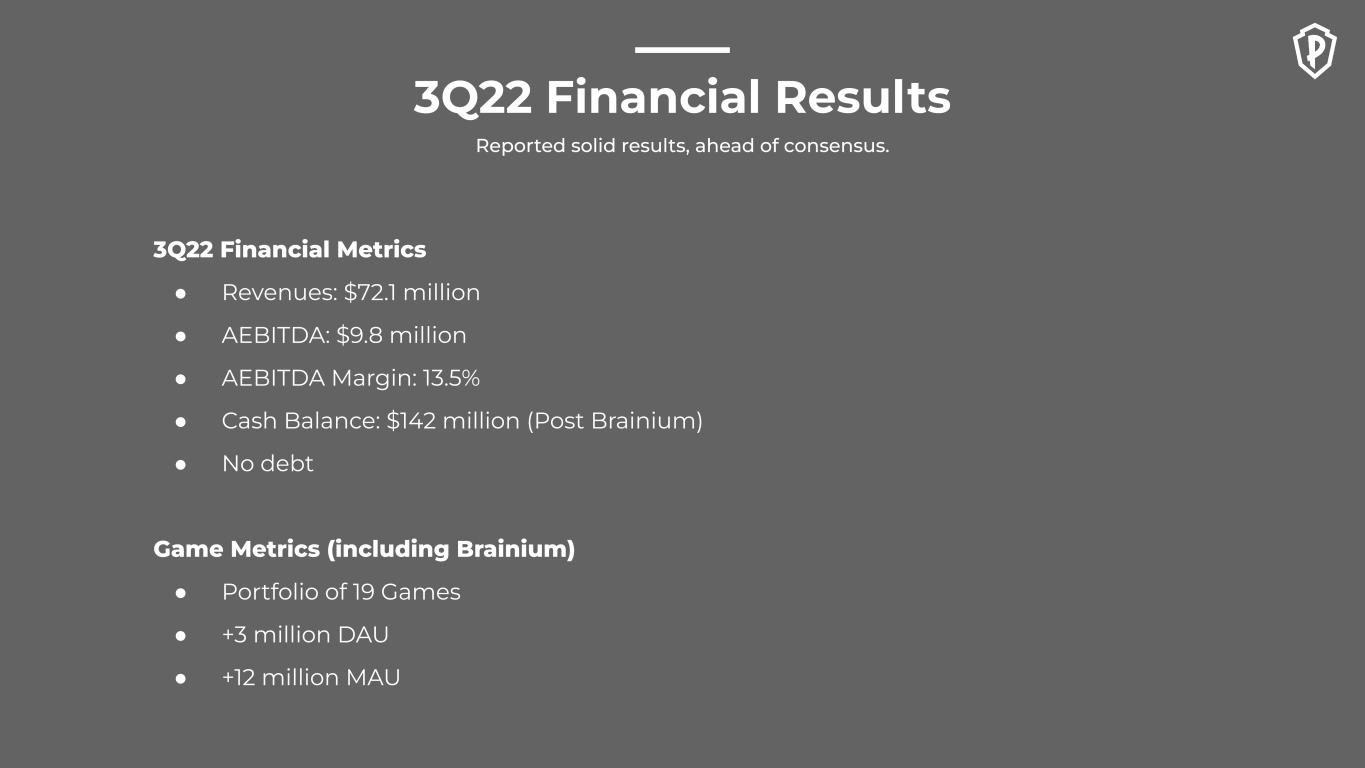 3Q22 Financial Metrics ● Revenues: $72.1 million ● AEBITDA: $9.8 million ● AEBITDA Margin: 13.5% ● Cash Balance: $142 million (Post Brainium) ● No debt Game Metrics (including Brainium) ● Portfolio of 19 Games ● +3 million DAU ● +12 million MAU Reported solid results, ahead of consensus. 3Q22 Financial Results