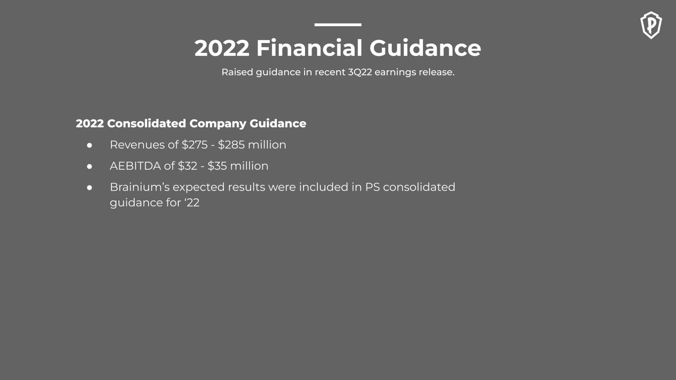 2022 Consolidated Company Guidance ● Revenues of $275 - $285 million ● AEBITDA of $32 - $35 million ● Brainium’s expected results were included in PS consolidated guidance for ‘22 Raised guidance in recent 3Q22 earnings release. 2022 Financial Guidance
