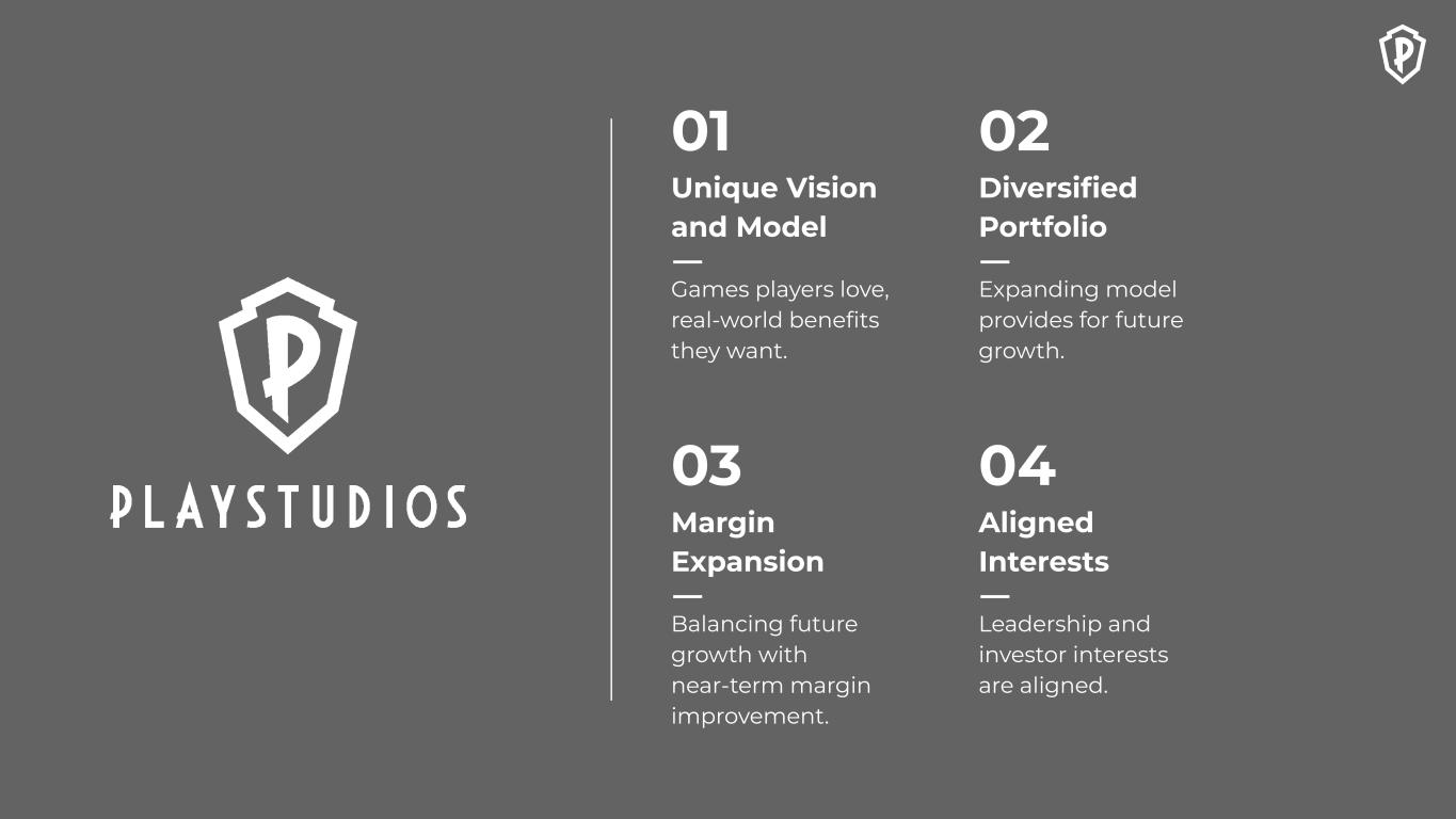 01 02 Unique Vision and Model Games players love, real-world benefits they want. Diversified Portfolio Expanding model provides for future growth. 03 04 Margin Expansion Balancing future growth with near-term margin improvement. Aligned Interests Leadership and investor interests are aligned.