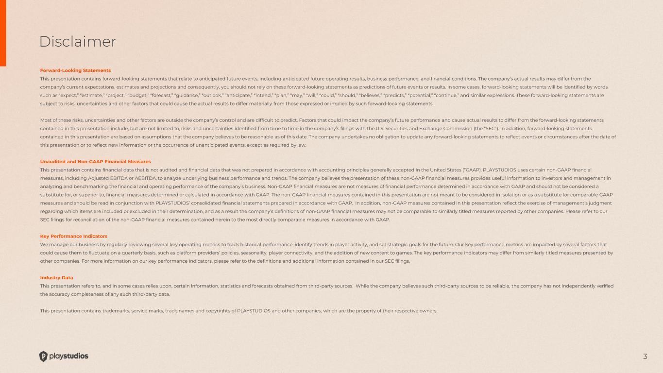 3 Disclaimer Forward-Looking Statements This presentation contains forward-looking statements that relate to anticipated future events, including anticipated future operating results, business performance, and financial conditions. The company’s actual results may differ from the company’s current expectations, estimates and projections and consequently, you should not rely on these forward-looking statements as predictions of future events or results. In some cases, forward-looking statements will be identified by words such as “expect,” “estimate,” “project,” “budget,” “forecast,” “guidance,” “outlook,” “anticipate,” “intend,” “plan,” “may,” “will,” “could,” “should,” “believes,” “predicts,” “potential,” “continue,” and similar expressions. These forward-looking statements are subject to risks, uncertainties and other factors that could cause the actual results to differ materially from those expressed or implied by such forward-looking statements. Most of these risks, uncertainties and other factors are outside the company’s control and are difficult to predict. Factors that could impact the company’s future performance and cause actual results to differ from the forward-looking statements contained in this presentation include, but are not limited to, risks and uncertainties identified from time to time in the company’s filings with the U.S. Securities and Exchange Commission (the “SEC”). In addition, forward-looking statements contained in this presentation are based on assumptions that the company believes to be reasonable as of this date. The company undertakes no obligation to update any forward-looking statements to reflect events or circumstances after the date of this presentation or to reflect new information or the occurrence of unanticipated events, except as required by law. Unaudited and Non-GAAP Financial Measures This presentation contains financial data that is not audited and financial data that was not prepared in accordance with accounting principles generally accepted in the United States (“GAAP). PLAYSTUDIOS uses certain non-GAAP financial measures, including Adjusted EBITDA or AEBITDA, to analyze underlying business performance and trends. The company believes the presentation of these non-GAAP financial measures provides useful information to investors and management in analyzing and benchmarking the financial and operating performance of the company’s business. Non-GAAP financial measures are not measures of financial performance determined in accordance with GAAP and should not be considered a substitute for, or superior to, financial measures determined or calculated in accordance with GAAP. The non-GAAP financial measures contained in this presentation are not meant to be considered in isolation or as a substitute for comparable GAAP measures and should be read in conjunction with PLAYSTUDIOS’ consolidated financial statements prepared in accordance with GAAP. In addition, non-GAAP measures contained in this presentation reflect the exercise of management’s judgment regarding which items are included or excluded in their determination, and as a result the company’s definitions of non-GAAP financial measures may not be comparable to similarly titled measures reported by other companies. Please refer to our SEC filings for reconciliation of the non-GAAP financial measures contained herein to the most directly comparable measures in accordance with GAAP. Key Performance Indicators We manage our business by regularly reviewing several key operating metrics to track historical performance, identify trends in player activity, and set strategic goals for the future. Our key performance metrics are impacted by several factors that could cause them to fluctuate on a quarterly basis, such as platform providers’ policies, seasonality, player connectivity, and the addition of new content to games. The key performance indicators may differ from similarly titled measures presented by other companies. For more information on our key performance indicators, please refer to the definitions and additional information contained in our SEC filings. Industry Data This presentation refers to, and in some cases relies upon, certain information, statistics and forecasts obtained from third-party sources. While the company believes such third-party sources to be reliable, the company has not independently verified the accuracy completeness of any such third-party data. This presentation contains trademarks, service marks, trade names and copyrights of PLAYSTUDIOS and other companies, which are the property of their respective owners.
