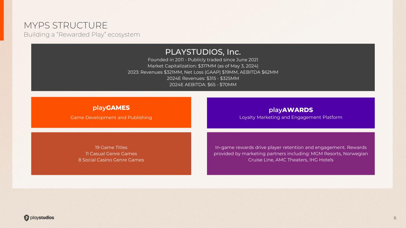 5 Key Investment Highlights PLAYSTUDIOS at-a-glance Rapidly Diversifying Game Portfolio Brainium and Tetris are diversifying revenue streams to faster growing and higher margin casual gaming segment. playAWARDS Platform a Key Differentiator Proprietary loyalty program creates value for players, publishers, and global brand partners. Preparing to externalize platform in 2024 to third party developers and strategic business partners. Strong Leadership with Aligned Interests Numerous executives and board members are among the largest shareholders. CEO is 2nd largest shareholder. Sustained Growth and Strong Capital Position Double-digit, 10-year CAGR. Cash positive business with ~$127MM on hand, as of 3/31/2024. $46MM share repurchase authorization availability as of 5/6/2024. $81MM available revolving credit line. Building a Tetris Franchise Looking to develop and release 1-2 new Tetris games this year and continue adding to library thereafter. Believe Tetris can be a core gaming franchise for MYPS.