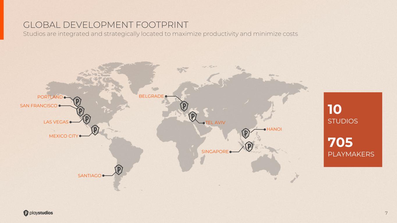 6 MYPS STRUCTURE Building a “Rewarded Play” ecosystem playAWARDS Loyalty Marketing and Engagement Platform In-game rewards drive player retention and engagement. Rewards provided by marketing partners including: MGM Resorts, Norwegian Cruise Line, AMC Theaters, IHG Hotels 19 Game Titles 11 Casual Genre Games 8 Social Casino Genre Games playGAMES Game Development and Publishing PLAYSTUDIOS, Inc. Founded in 2011 - Publicly traded since June 2021 Market Capitalization: $317MM (as of May 3, 2024) 2023: Revenues $321MM, Net Loss (GAAP) $19MM, AEBITDA $62MM 2024E Revenues: $315 - $325MM 2024E AEBITDA: $65 - $70MM