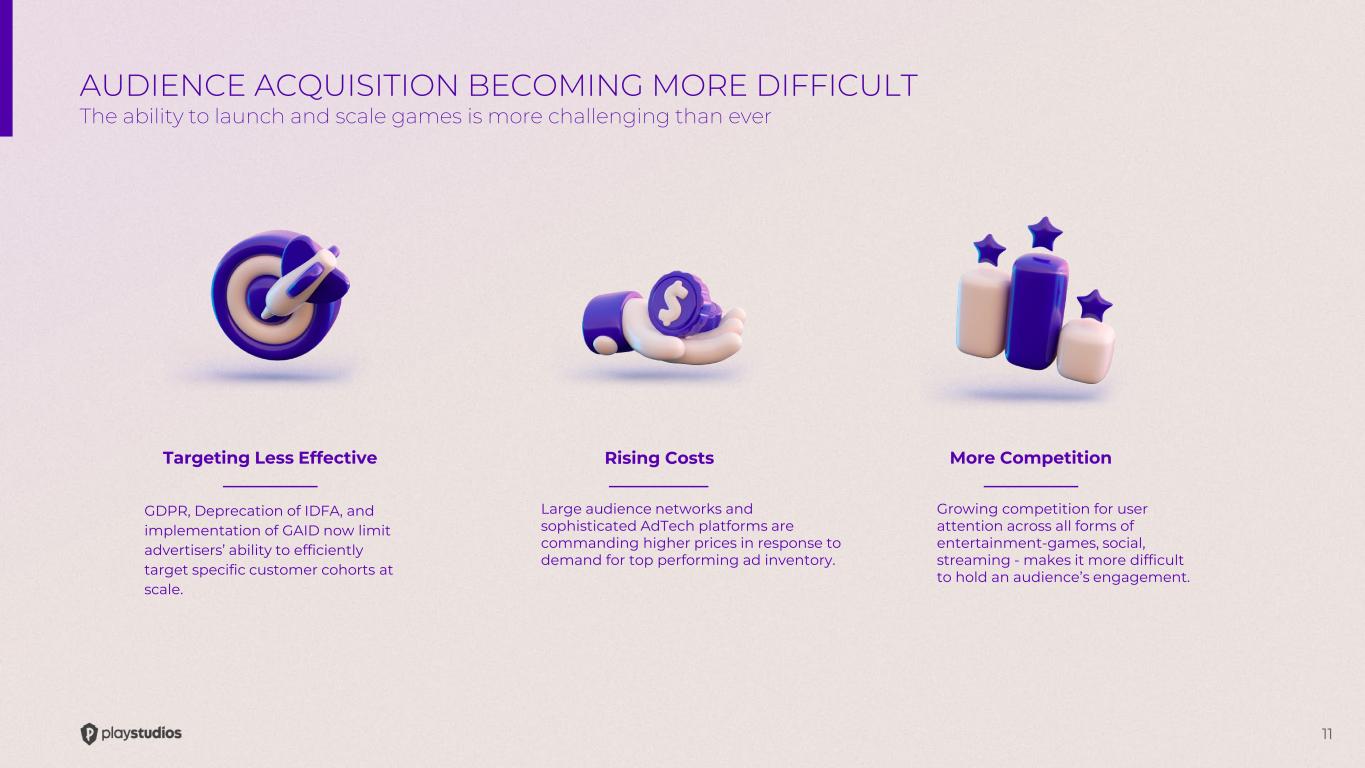11 AUDIENCE ACQUISITION BECOMING MORE DIFFICULT The ability to launch and scale games is more challenging than ever Rising Costs Large audience networks and sophisticated AdTech platforms are commanding higher prices in response to demand for top performing ad inventory. Targeting Less Effective GDPR, Deprecation of IDFA, and implementation of GAID now limit advertisers’ ability to efficiently target specific customer cohorts at scale. More Competition Growing competition for user attention across all forms of entertainment-games, social, streaming - makes it more difficult to hold an audience’s engagement.