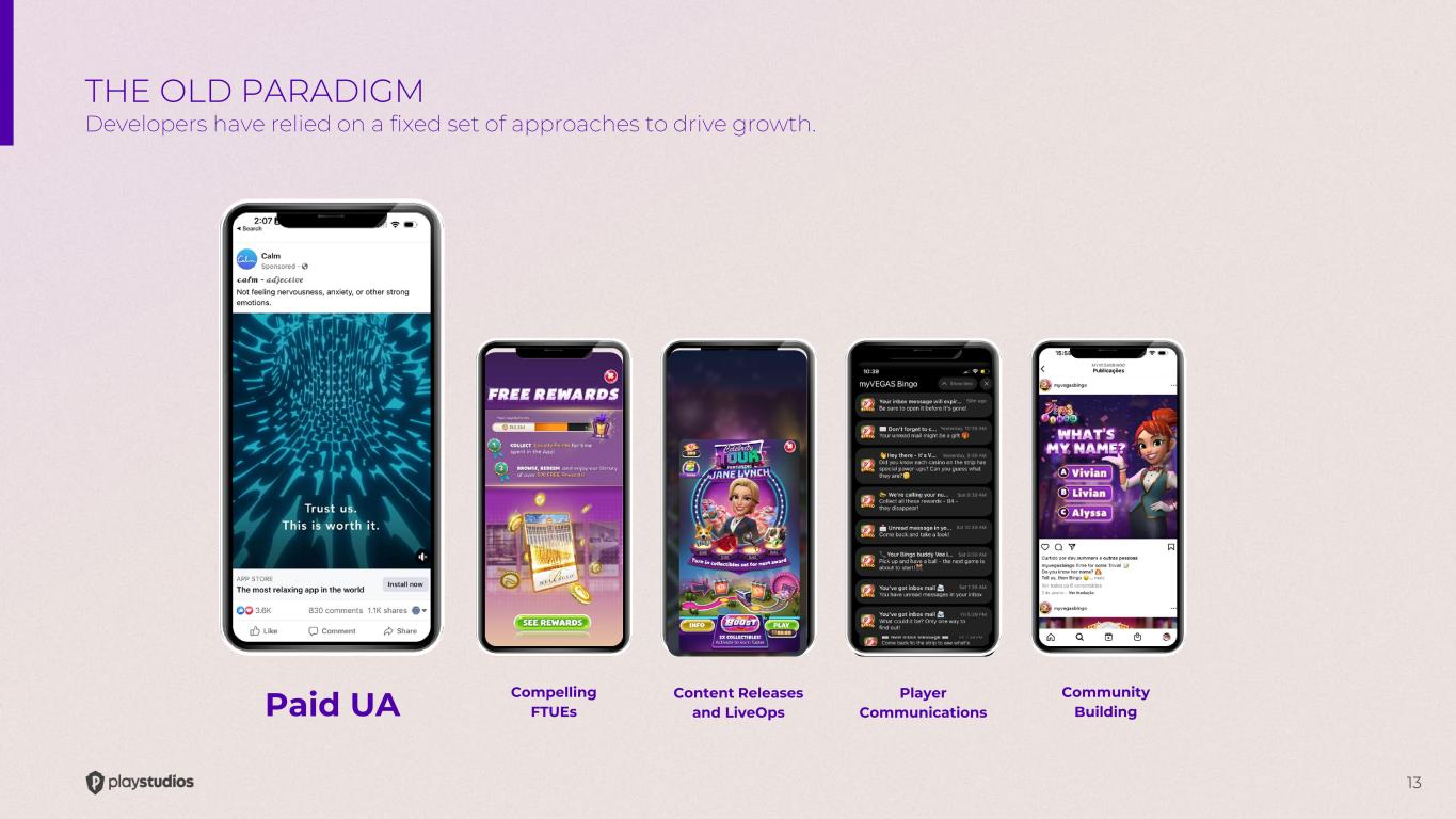 13 Community Building Content Releases and LiveOps Player Communications Compelling FTUEsPaid UA THE OLD PARADIGM Developers have relied on a fixed set of approaches to drive growth.
