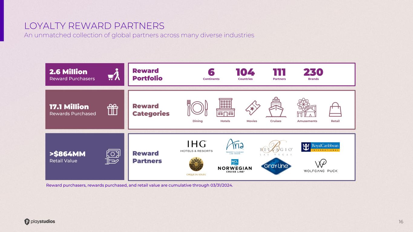 15 Player Progression Tiers Players “chase” an increasingly valuable collection of in-game benefits, including elevated VIP Status. This type of progression mechanic is a proven driver of game engagement and retention. Rewards Marketplace By offering engaged players real- world rewards, they are more likely to remain within our PLAYSTUDIOS ecosystem. Loyalty Currency As players engage with our games, they accumulate a “loyalty currency” that can be exchanged for real-world rewards. This currency offers a measure of progress toward a gamified goal. VIP Services Our highest value players have access to dedicated VIP hosts who extend personalized service and tailored benefits. THE playAWARDS PLATFORM The building blocks of player retention and engagement