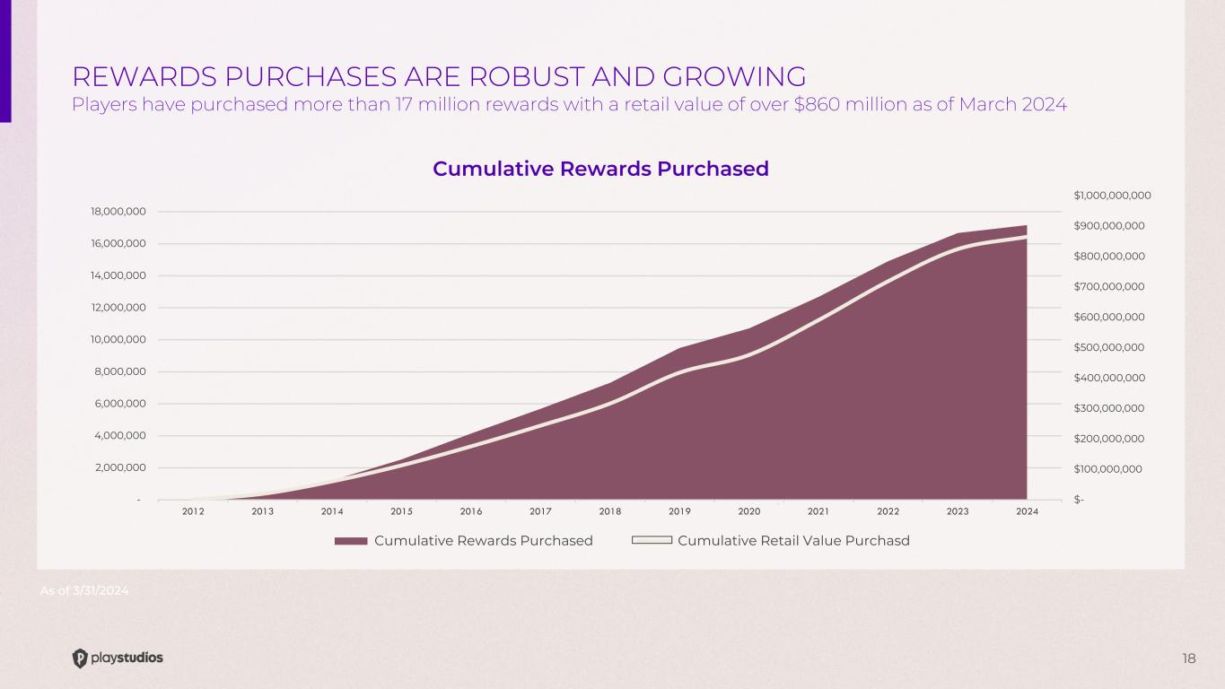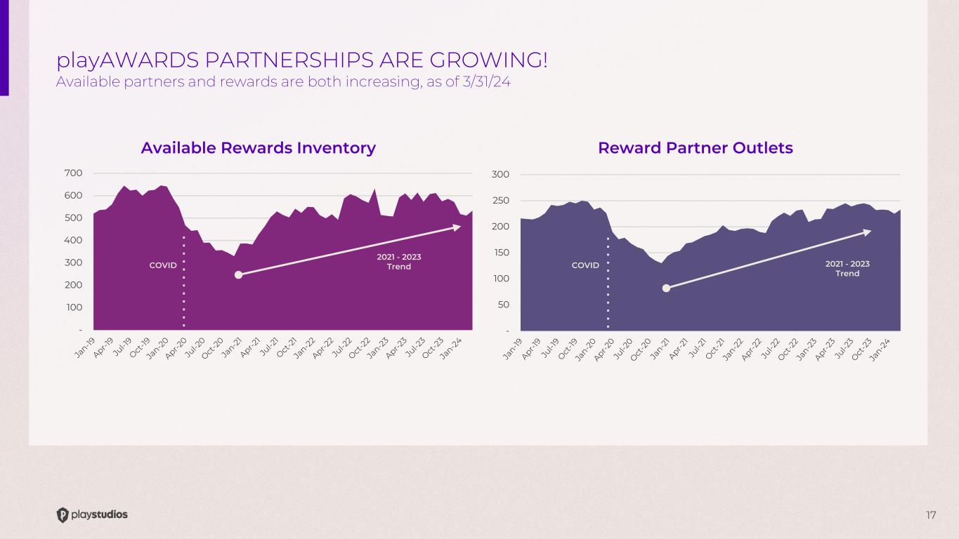 17 - 50 100 150 200 250 300 - 100 200 300 400 500 600 700 Available Rewards Inventory Reward Partner Outlets COVID COVID 2021 - 2023 Trend 2021 - 2023 Trend playAWARDS PARTNERSHIPS ARE GROWING! Available partners and rewards are both increasing, as of 3/31/24
