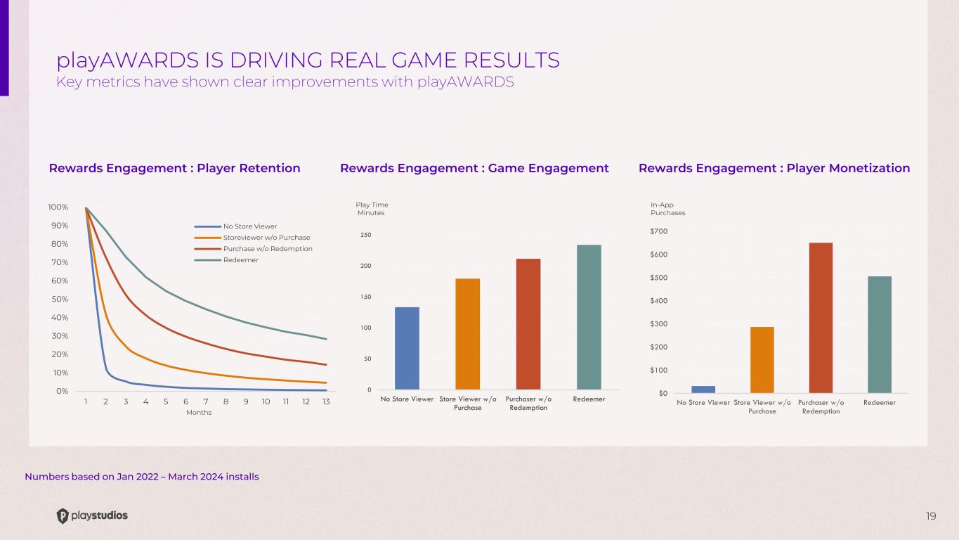 18 Cumulative Rewards Purchased COVID As of 3/31/2024 REWARDS PURCHASES ARE ROBUST AND GROWING Players have purchased more than 17 million rewards with a retail value of over $860 million as of March 2024 $- $100,000,000 $200,000,000 $300,000,000 $400,000,000 $500,000,000 $600,000,000 $700,000,000 $800,000,000 $900,000,000 $1,000,000,000 - 2,000,000 4,000,000 6,000,000 8,000,000 10,000,000 12,000,000 14,000,000 16,000,000 18,000,000 2012 2013 2014 2015 2016 2017 2018 2019 2020 2021 2022 2023 2024 Cumulative Rewards Purchased Cumulative Retail Value Purchasd