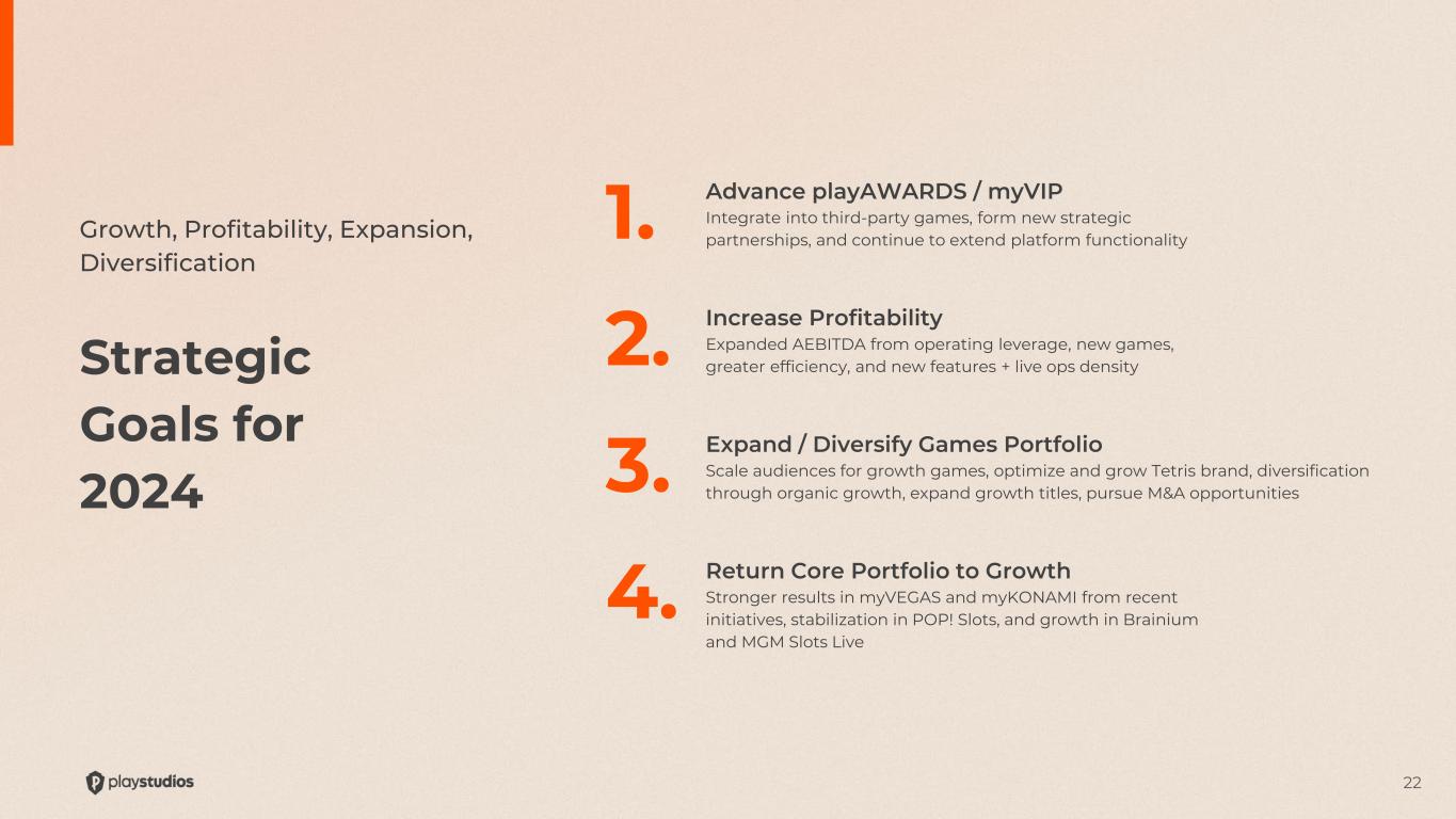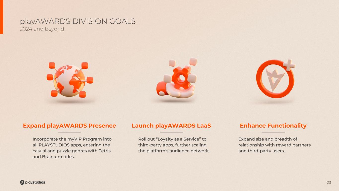 22 1. Advance playAWARDS / myVIP Integrate into third-party games, form new strategic partnerships, and continue to extend platform functionality 2. Increase Profitability Expanded AEBITDA from operating leverage, new games, greater efficiency, and new features + live ops density 3. Expand / Diversify Games Portfolio Scale audiences for growth games, optimize and grow Tetris brand, diversification through organic growth, expand growth titles, pursue M&A opportunities 4. Return Core Portfolio to Growth Stronger results in myVEGAS and myKONAMI from recent initiatives, stabilization in POP! Slots, and growth in Brainium and MGM Slots Live Strategic Goals for 2024 Growth, Profitability, Expansion, Diversification