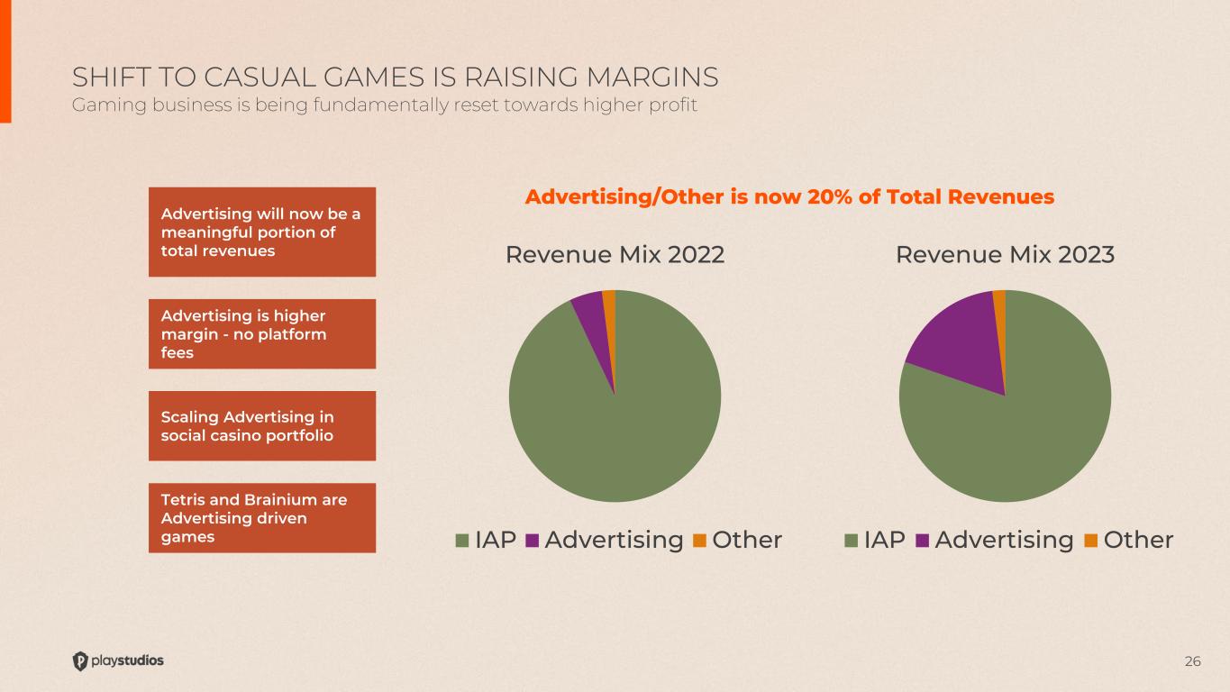 25 MYPS 2023 ~20% AEBITDA Margins Peer Group ~32% AEBITDA Margins* Leverage Fixed Costs Optimize Profitability of Newest Games Improve Profitability of Core Portfolio STRONG MARGINS GAINS IN 2023 CAN CONTINUE Our current initiatives support continued margin growth MYPS 2022 ~13% AEBITDA Margins +700bps GOAL MARGIN OPTIMIZATION FOCUS *Peer group includes Playtika Holding Corp., Huuuge Inc., and DoubleDown Interactive Co Ltd. AEBITDA margins do not exclude Software Capitalization.