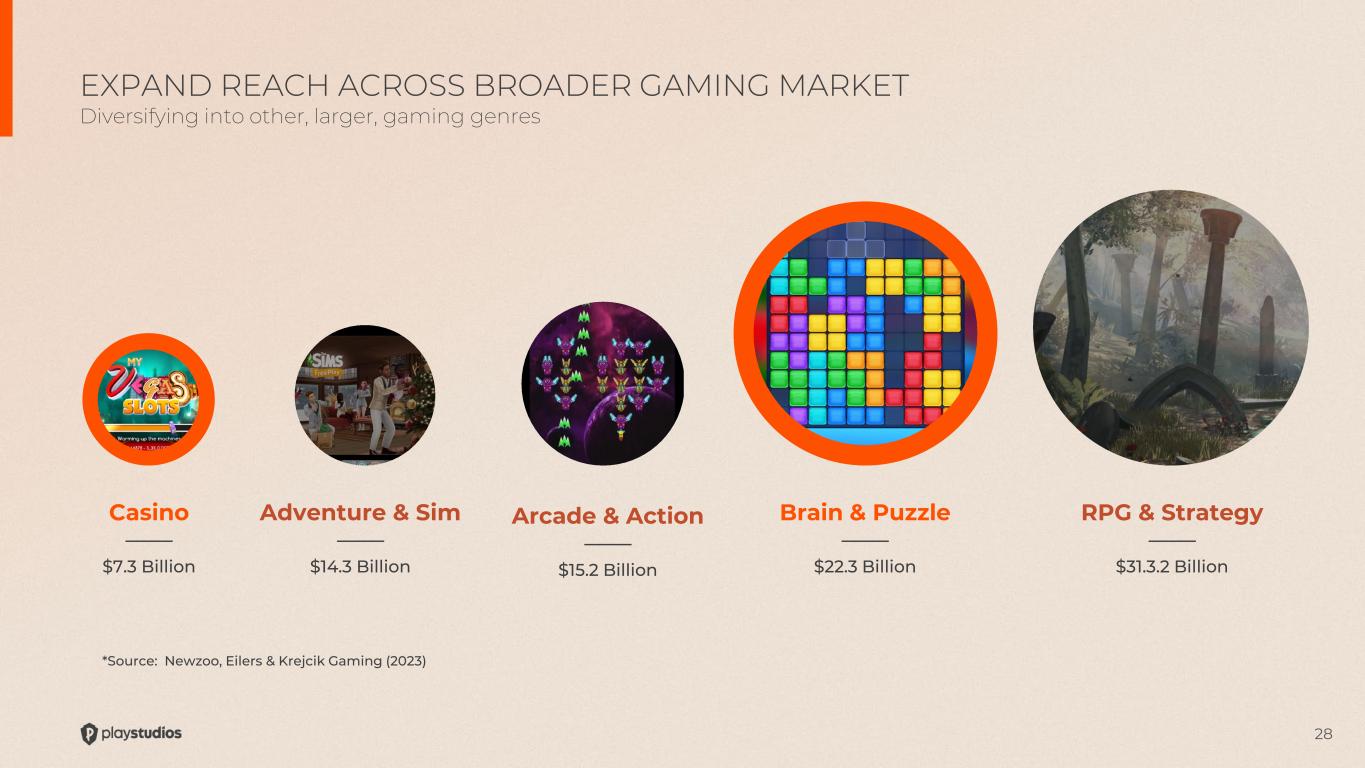27 THE CASUAL GAMING MARKET IS 3X THE SIZE OF SOCIAL CASINO New Game Mix Targets Larger TAM 2024 Portfolio of Games 2022 Portfolio of Games (pre-Brainium) Social Casino Casual Games $7.3B Total Addressable Market, by Game Genre $22.3B 8 Games 1 Game 8 Games 11 Games Social Casino Casual Games LARGEST CATEGORY OF GAME TITLES FOR MYPS IS CASUAL Gaming business is being reset towards higher growth and profits *Source for Total Addressable Market: Newzoo, Eilers & Krejcik Gaming (2023)