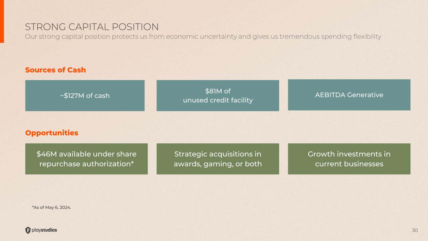 30 $46M available under share repurchase authorization* ~$127M of cash Sources of Cash Opportunities $81M of unused credit facility AEBITDA Generative Strategic acquisitions in awards, gaming, or both Growth investments in current businesses STRONG CAPITAL POSITION Our strong capital position protects us from economic uncertainty and gives us tremendous spending flexibility *As of May 6, 2024.