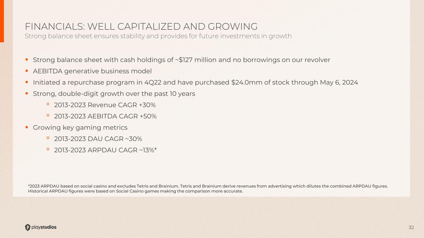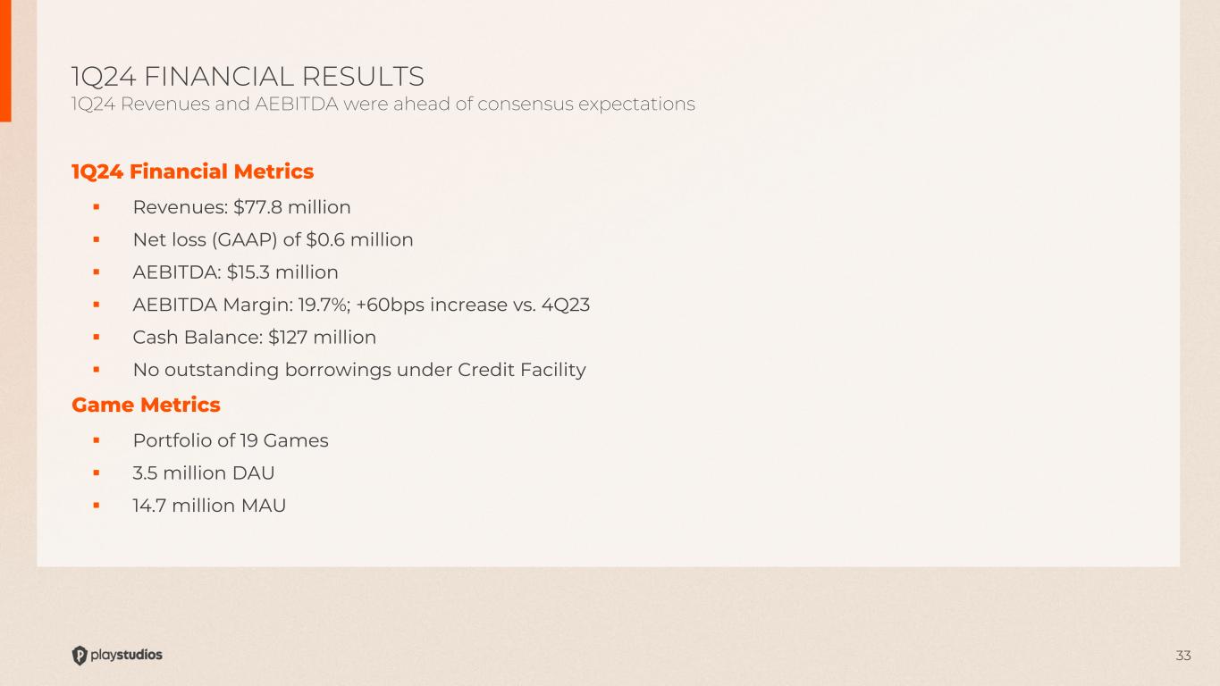 32  Strong balance sheet with cash holdings of ~$127 million and no borrowings on our revolver  AEBITDA generative business model  Initiated a repurchase program in 4Q22 and have purchased $24.0mm of stock through May 6, 2024  Strong, double-digit growth over the past 10 years ▫ 2013-2023 Revenue CAGR +30% ▫ 2013-2023 AEBITDA CAGR +50%  Growing key gaming metrics ▫ 2013-2023 DAU CAGR ~30% ▫ 2013-2023 ARPDAU CAGR ~13%* FINANCIALS: WELL CAPITALIZED AND GROWING Strong balance sheet ensures stability and provides for future investments in growth *2023 ARPDAU based on social casino and excludes Tetris and Brainium. Tetris and Brainium derive revenues from advertising which dilutes the combined ARPDAU figures. Historical ARPDAU figures were based on Social Casino games making the comparison more accurate.