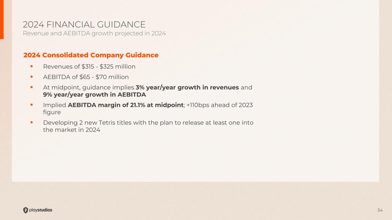 33 1Q24 Financial Metrics  Revenues: $77.8 million  Net loss (GAAP) of $0.6 million  AEBITDA: $15.3 million  AEBITDA Margin: 19.7%; +60bps increase vs. 4Q23  Cash Balance: $127 million  No outstanding borrowings under Credit Facility Game Metrics  Portfolio of 19 Games  3.5 million DAU  14.7 million MAU 1Q24 FINANCIAL RESULTS 1Q24 Revenues and AEBITDA were ahead of consensus expectations