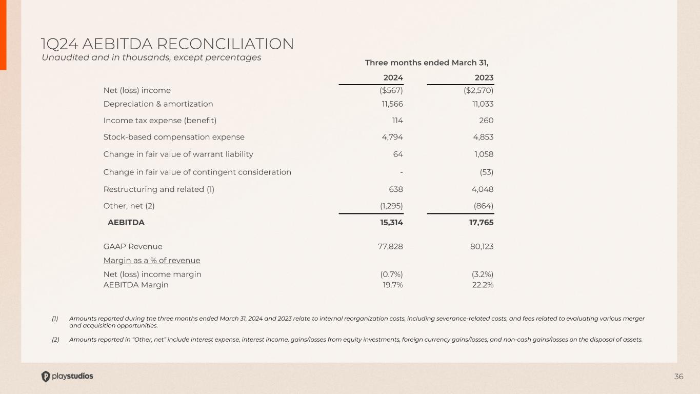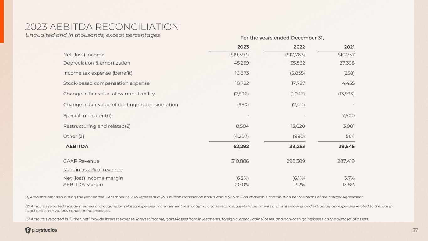 36 (1) Amounts reported during the three months ended March 31, 2024 and 2023 relate to internal reorganization costs, including severance-related costs, and fees related to evaluating various merger and acquisition opportunities. (2) Amounts reported in “Other, net” include interest expense, interest income, gains/losses from equity investments, foreign currency gains/losses, and non-cash gains/losses on the disposal of assets. 1Q24 AEBITDA RECONCILIATION Unaudited and in thousands, except percentages Three months ended March 31, 2024 2023 Net (loss) income ($567) ($2,570) Depreciation & amortization 11,566 11,033 Income tax expense (benefit) 114 260 Stock-based compensation expense 4,794 4,853 Change in fair value of warrant liability 64 1,058 Change in fair value of contingent consideration - (53) Restructuring and related (1) 638 4,048 Other, net (2) (1,295) (864) AEBITDA 15,314 17,765 GAAP Revenue 77,828 80,123 Margin as a % of revenue Net (loss) income margin (0.7%) (3.2%) AEBITDA Margin 19.7% 22.2%