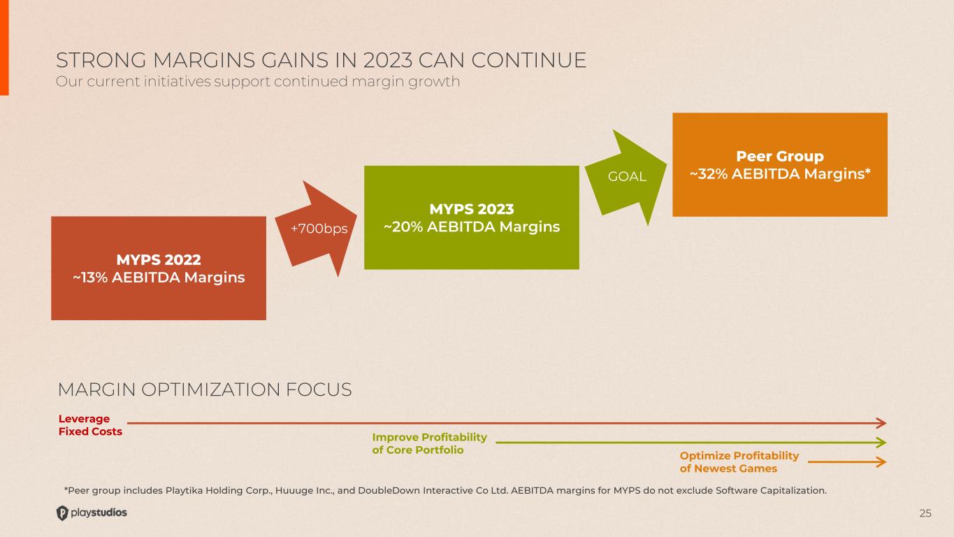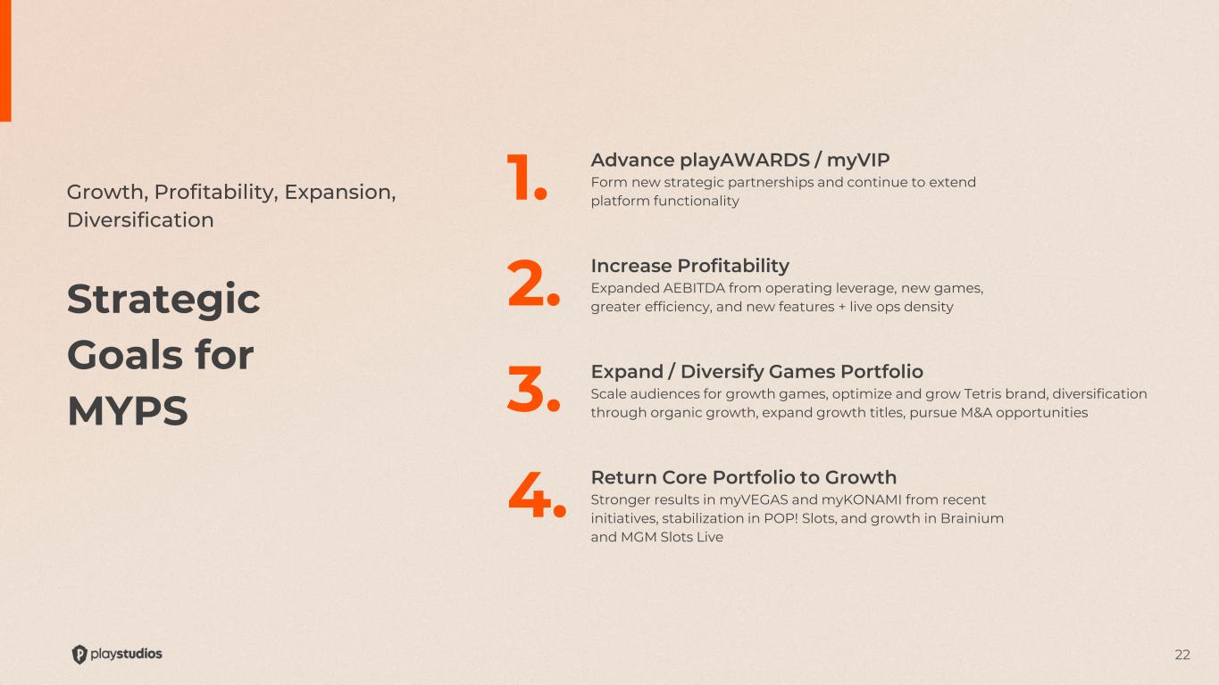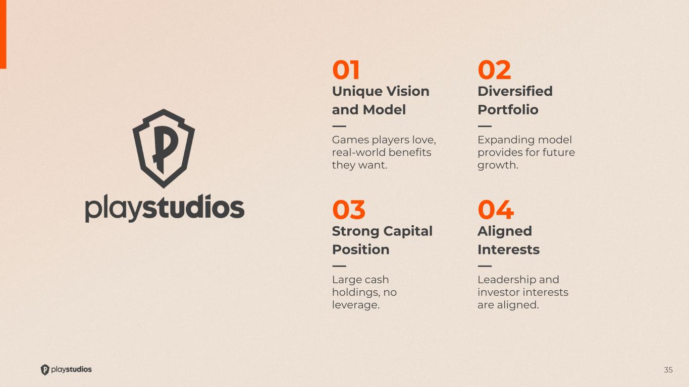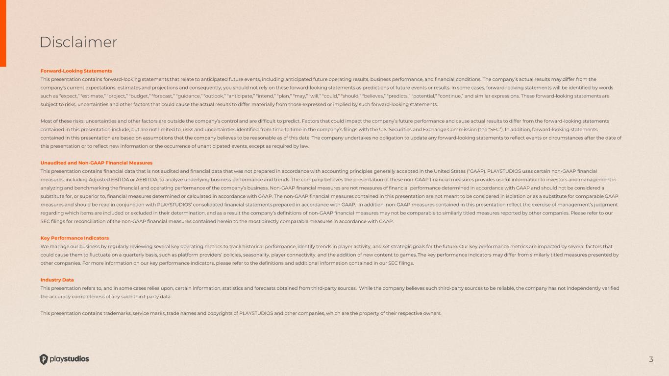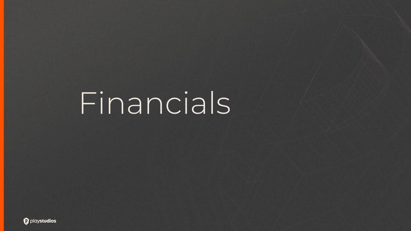 3 Disclaimer Forward-Looking Statements This presentation contains forward-looking statements that relate to anticipated future events, including anticipated future operating results, business performance, and financial conditions. The company’s actual results may differ from the company’s current expectations, estimates and projections and consequently, you should not rely on these forward-looking statements as predictions of future events or results. In some cases, forward-looking statements will be identified by words such as “expect,” “estimate,” “project,” “budget,” “forecast,” “guidance,” “outlook,” “anticipate,” “intend,” “plan,” “may,” “will,” “could,” “should,” “believes,” “predicts,” “potential,” “continue,” and similar expressions. These forward-looking statements are subject to risks, uncertainties and other factors that could cause the actual results to differ materially from those expressed or implied by such forward-looking statements. Most of these risks, uncertainties and other factors are outside the company’s control and are difficult to predict. Factors that could impact the company’s future performance and cause actual results to differ from the forward-looking statements contained in this presentation include, but are not limited to, risks and uncertainties identified from time to time in the company’s filings with the U.S. Securities and Exchange Commission (the “SEC”). In addition, forward-looking statements contained in this presentation are based on assumptions that the company believes to be reasonable as of this date. The company undertakes no obligation to update any forward-looking statements to reflect events or circumstances after the date of this presentation or to reflect new information or the occurrence of unanticipated events, except as required by law. Unaudited and Non-GAAP Financial Measures This presentation contains financial data that is not audited and financial data that was not prepared in accordance with accounting principles generally accepted in the United States (“GAAP). PLAYSTUDIOS uses certain non-GAAP financial measures, including Adjusted EBITDA or AEBITDA, to analyze underlying business performance and trends. The company believes the presentation of these non-GAAP financial measures provides useful information to investors and management in analyzing and benchmarking the financial and operating performance of the company’s business. Non-GAAP financial measures are not measures of financial performance determined in accordance with GAAP and should not be considered a substitute for, or superior to, financial measures determined or calculated in accordance with GAAP. The non-GAAP financial measures contained in this presentation are not meant to be considered in isolation or as a substitute for comparable GAAP measures and should be read in conjunction with PLAYSTUDIOS’ consolidated financial statements prepared in accordance with GAAP. In addition, non-GAAP measures contained in this presentation reflect the exercise of management’s judgment regarding which items are included or excluded in their determination, and as a result the company’s definitions of non-GAAP financial measures may not be comparable to similarly titled measures reported by other companies. Please refer to our SEC filings for reconciliation of the non-GAAP financial measures contained herein to the most directly comparable measures in accordance with GAAP. Key Performance Indicators We manage our business by regularly reviewing several key operating metrics to track historical performance, identify trends in player activity, and set strategic goals for the future. Our key performance metrics are impacted by several factors that could cause them to fluctuate on a quarterly basis, such as platform providers’ policies, seasonality, player connectivity, and the addition of new content to games. The key performance indicators may differ from similarly titled measures presented by other companies. For more information on our key performance indicators, please refer to the definitions and additional information contained in our SEC filings. Industry Data This presentation refers to, and in some cases relies upon, certain information, statistics and forecasts obtained from third-party sources. While the company believes such third-party sources to be reliable, the company has not independently verified the accuracy completeness of any such third-party data. This presentation contains trademarks, service marks, trade names and copyrights of PLAYSTUDIOS and other companies, which are the property of their respective owners.