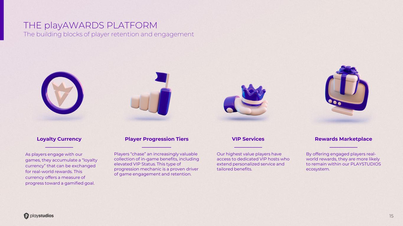 14 THE NEW PARADIGM Developers can leverage loyalty mechanics and real rewards to add a new dimension to their growth strategies. Player Communications Community Building Compelling FTUEs Paid UA Loyalty = Retention Content Releases and LiveOps