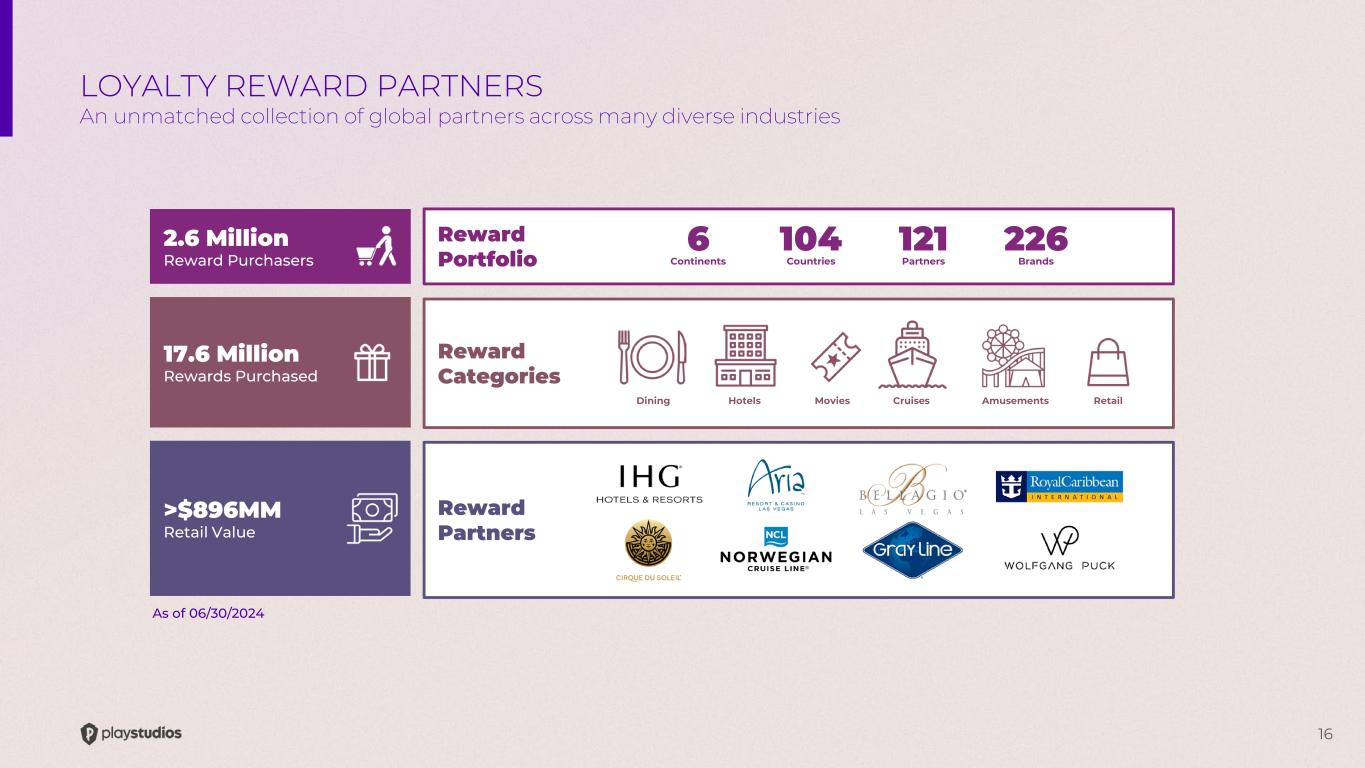 15 Player Progression Tiers Players “chase” an increasingly valuable collection of in-game benefits, including elevated VIP Status. This type of progression mechanic is a proven driver of game engagement and retention. Rewards Marketplace By offering engaged players real- world rewards, they are more likely to remain within our PLAYSTUDIOS ecosystem. Loyalty Currency As players engage with our games, they accumulate a “loyalty currency” that can be exchanged for real-world rewards. This currency offers a measure of progress toward a gamified goal. VIP Services Our highest value players have access to dedicated VIP hosts who extend personalized service and tailored benefits. THE playAWARDS PLATFORM The building blocks of player retention and engagement