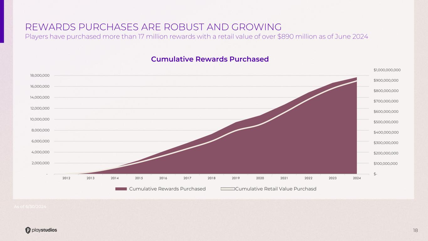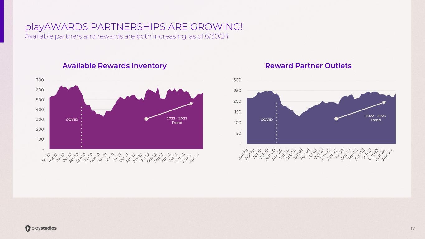 17 Available Rewards Inventory Reward Partner Outlets - 100 200 300 400 500 600 700 playAWARDS PARTNERSHIPS ARE GROWING! Available partners and rewards are both increasing, as of 6/30/24 COVID 2022 - 2023 Trend - 50 100 150 200 250 300 COVID 2022 - 2023 Trend