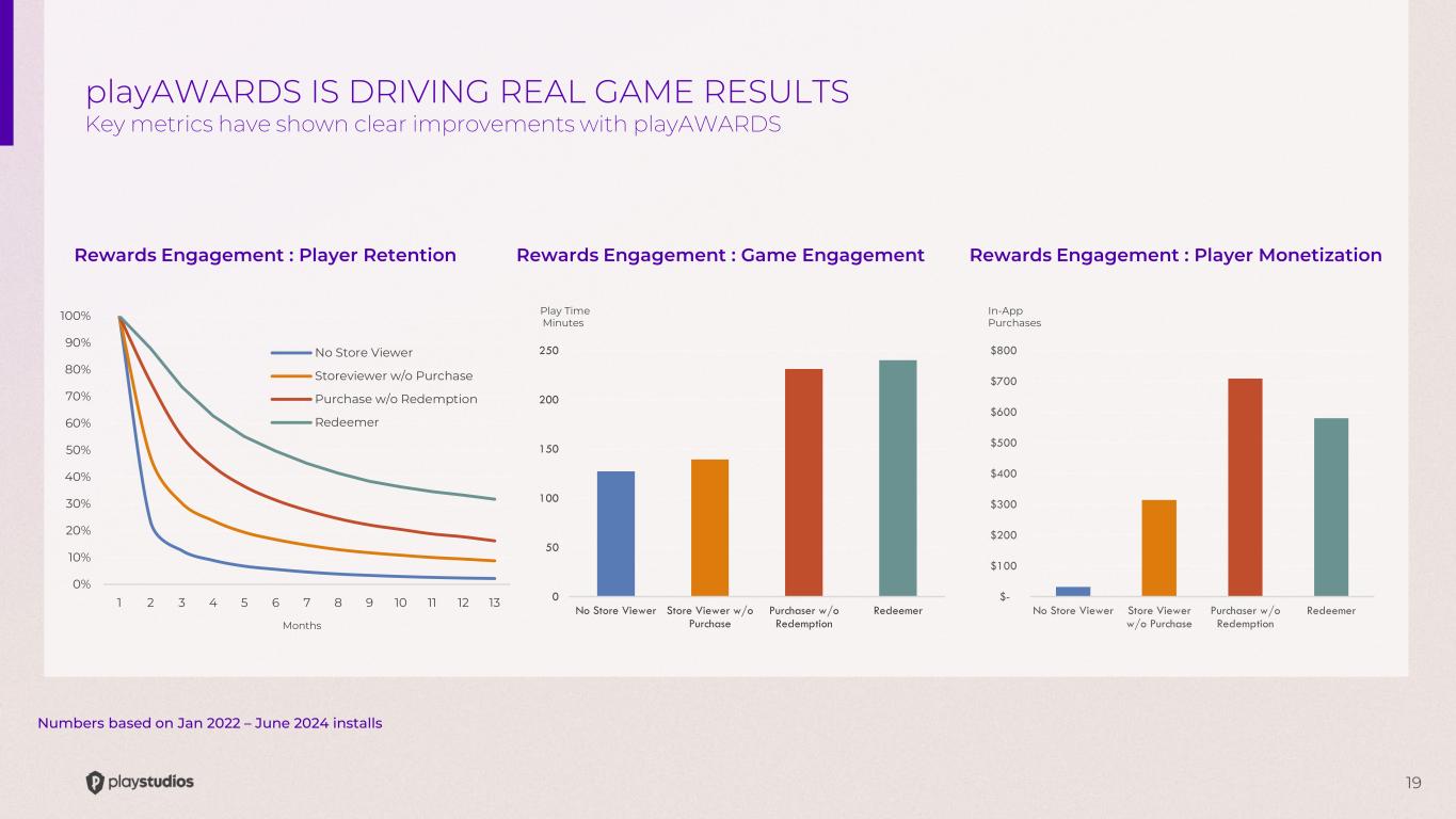18 Cumulative Rewards Purchased COVID As of 6/30/2024 REWARDS PURCHASES ARE ROBUST AND GROWING Players have purchased more than 17 million rewards with a retail value of over $890 million as of June 2024 $- $100,000,000 $200,000,000 $300,000,000 $400,000,000 $500,000,000 $600,000,000 $700,000,000 $800,000,000 $900,000,000 $1,000,000,000 - 2,000,000 4,000,000 6,000,000 8,000,000 10,000,000 12,000,000 14,000,000 16,000,000 18,000,000 2012 2013 2014 2015 2016 2017 2018 2019 2020 2021 2022 2023 2024 Cumulative Rewards Purchased Cumulative Retail Value Purchasd